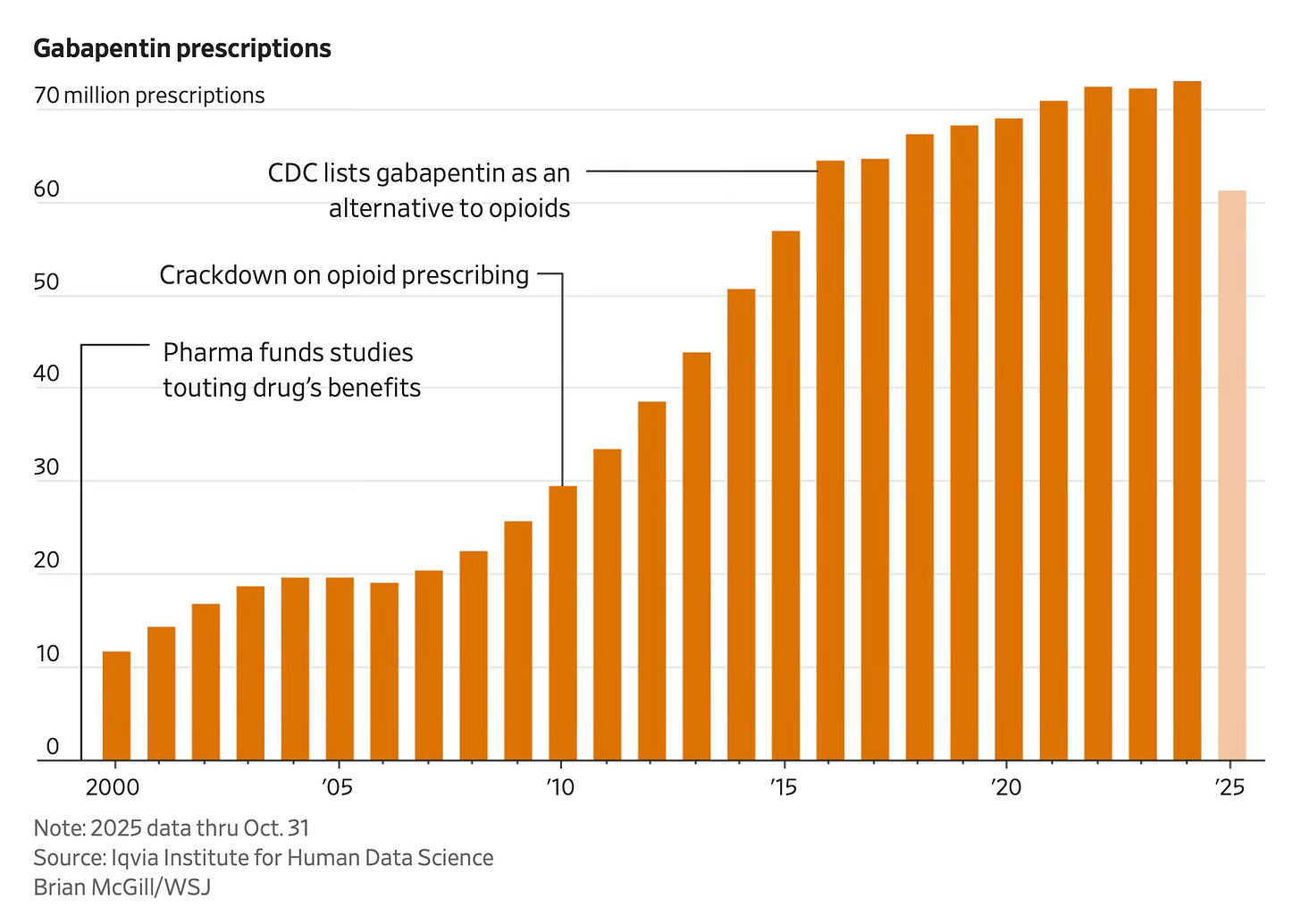 Gabapentin prescriptions have climbed to nearly 70 million a year. As the US clamped down on opioid prescribing, the drug was promoted as a safer alternative for chronic pain and anxiety. Prescribing accelerated, especially after the CDC signalled support for its use.