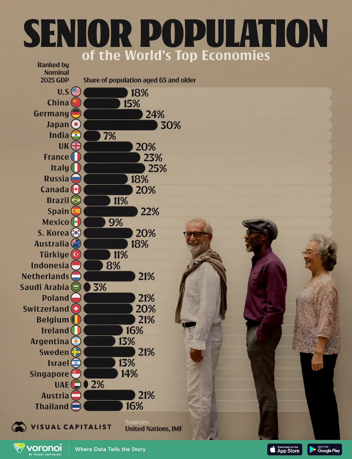 The contrast with younger economies is stark. India, Indonesia and Mexico still have relatively small senior populations. That creates a different set of challenges and opportunities, from labour supply to pension sustainability. The United States sits in the middle at 18%, younger than most of Europe but ageing steadily as the baby boom generation retires.