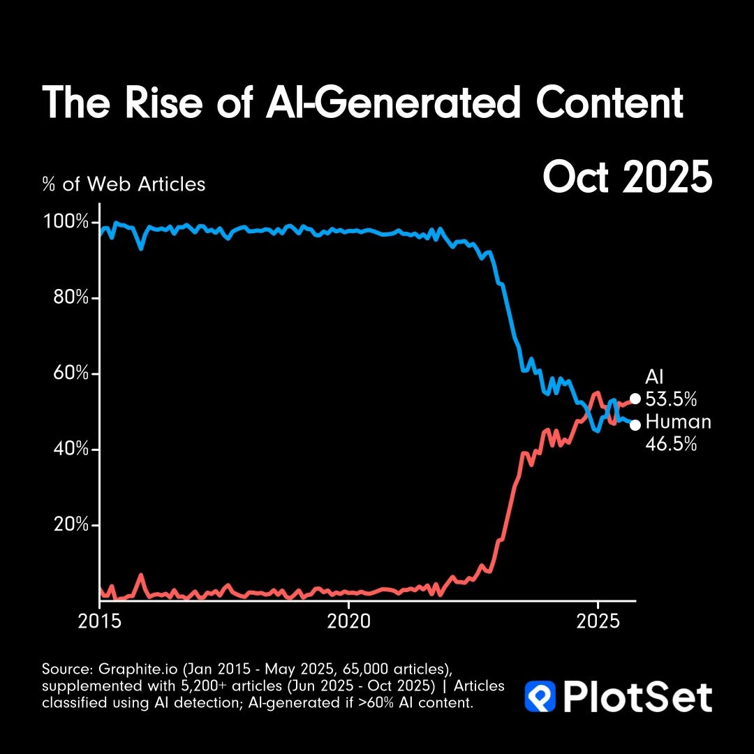 But here’s what the headline number doesn’t tell you: the total volume of content being created has exploded. Humans aren’t writing less, they’re writing more than ever. The marginal cost of producing content has collapsed. An article that once took a day now takes 30 minutes. This hasn’t replaced human writers, it’s raised the bar. We’re being forced to compete harder, write sharper, and deliver more value.