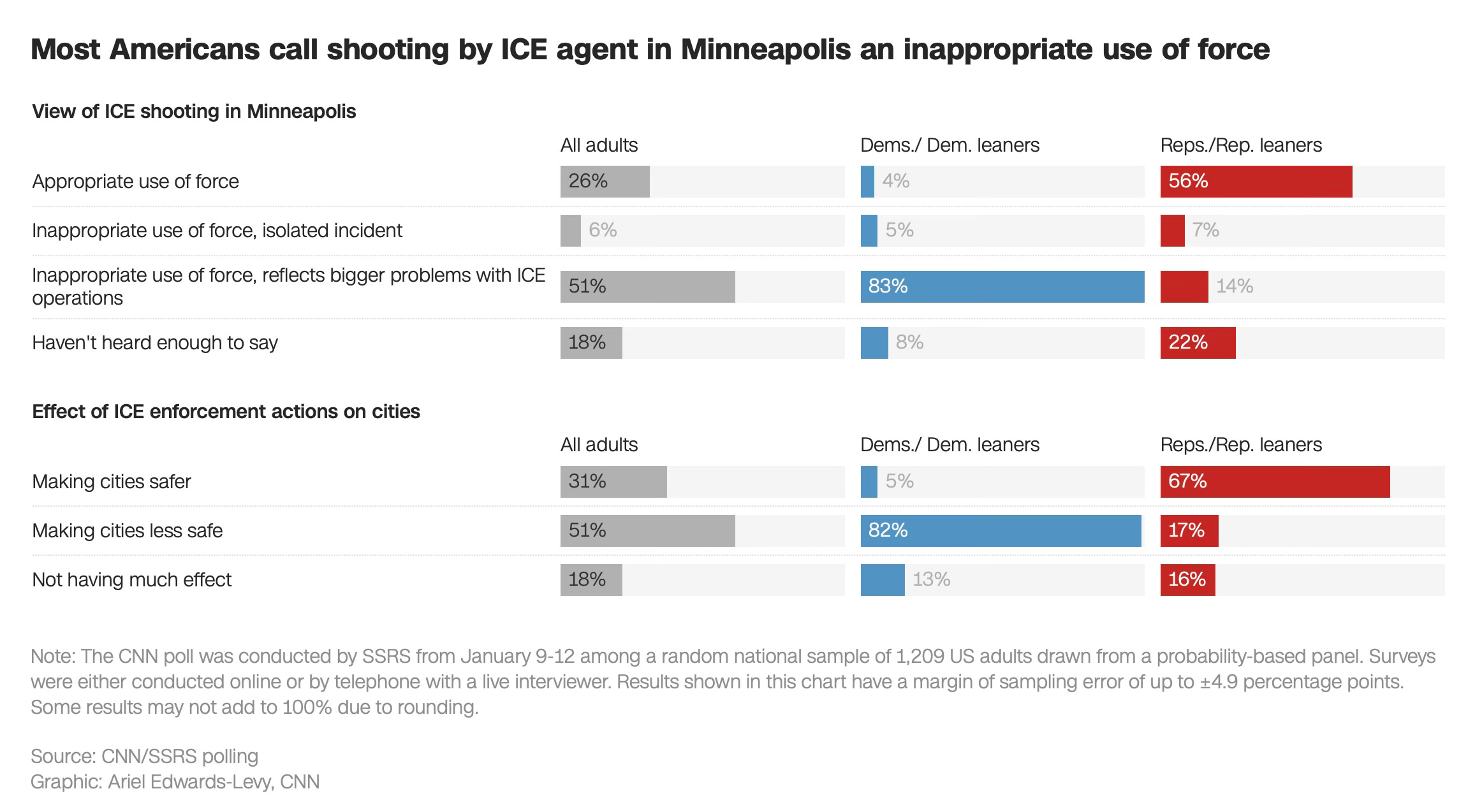A majority of adults see the ICE shooting in Minneapolis as inappropriate, with 51% saying it reflects wider problems in ICE operations. Among Democrats and leaners that view jumps to 83%. Republicans and leaners move the other way, with 56% calling it appropriate.