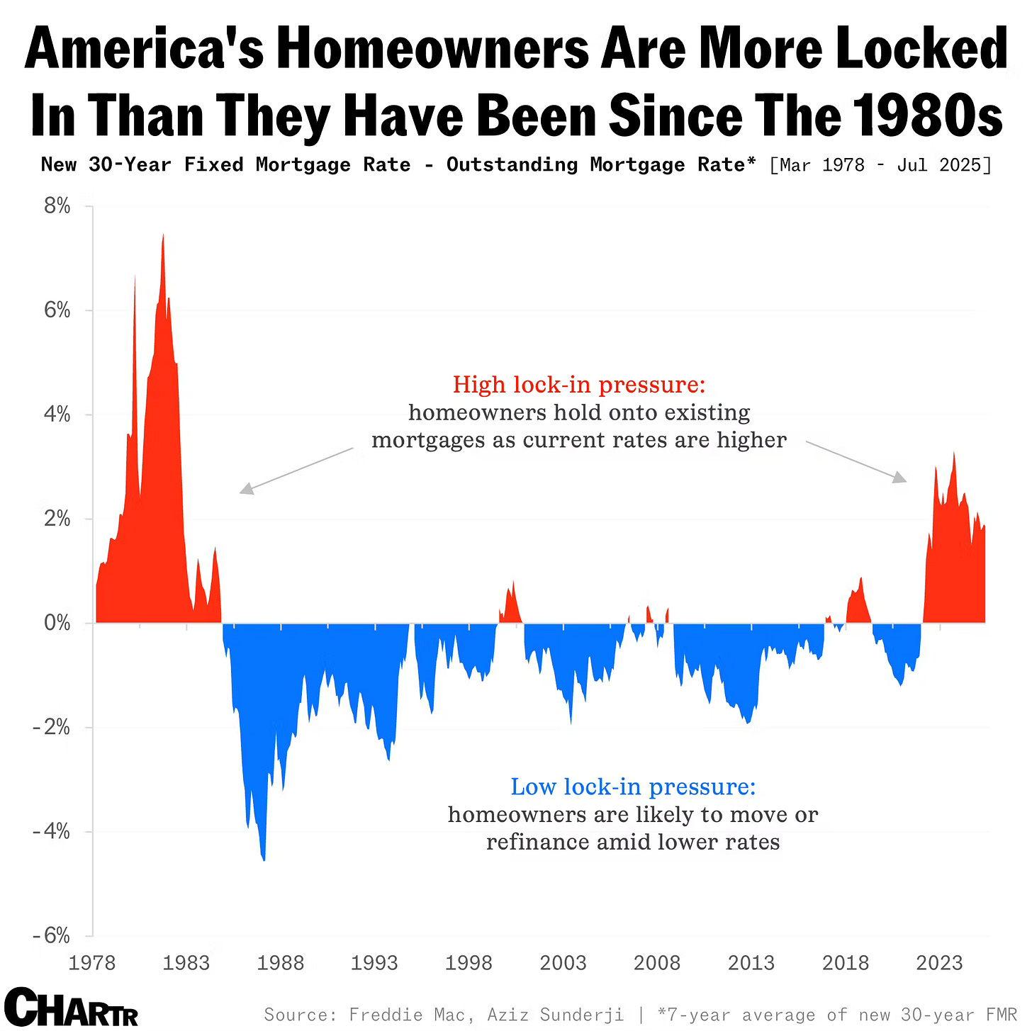 The US housing market has become a prison of its own making. 58% of Fannie Mae single-family loans carry rates below 4%, while new mortgages hover stubbornly above 6.5%. This creates the most severe lock-in effect since the early 1980s – when Paul Volcker's Fed sent rates into the stratosphere.