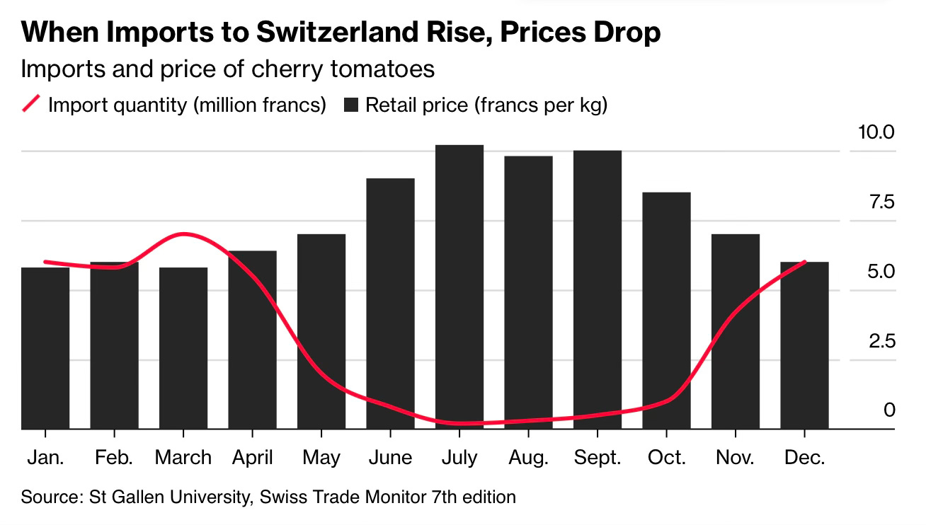 Of course, this isn’t always the case. Cherries from Zug, for example, do cost less when they’re in season. Once a year, I give five francs to my kids, and in the autumn, they get as many crunchy apples as they want at school, thanks to the local farmers. Apple prices genuinely drop during these harvest seasons, but it is not always the case. There are those tariff-distorted oddities that make little sense to most ordinary people – just like cherry tomatoes. Weird right?