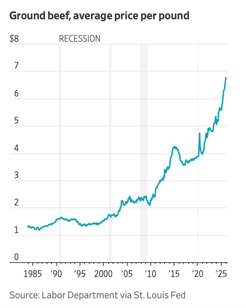 But what is most interesting about this is that ground beef is not a luxury good. It is a staple. When staple protein prices double over a generation and then accelerate again within a few years, households feel it immediately.