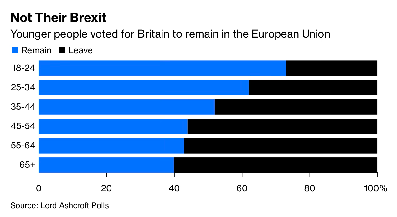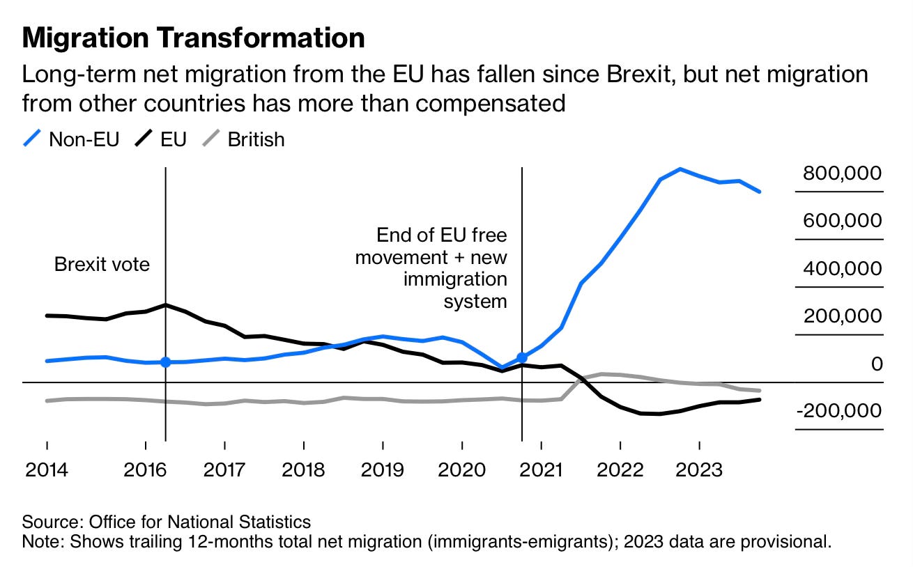 There is clear demand for closer ties with Europe. Take a look at these charts from Bloomberg. At the time of the Brexit referendum, young people overwhelmingly voted to remain in the EU. Meanwhile, migration from the EU has plummeted, leading to a surge in migration from non-EU countries, reaching levels that far exceed those seen before Brexit.