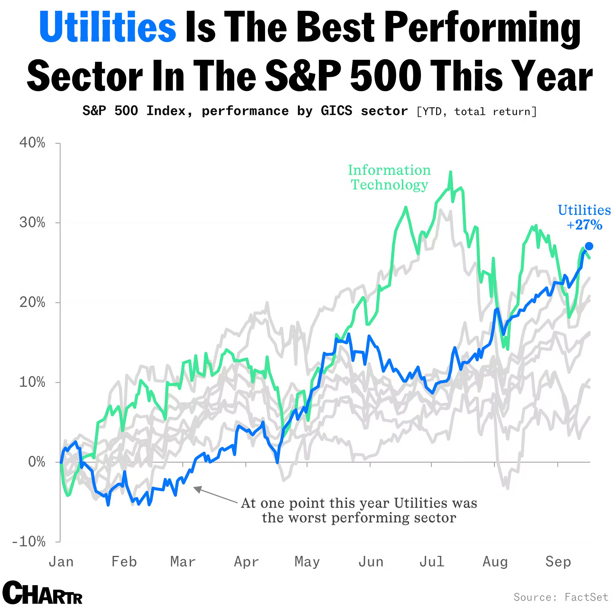 In a twist that has caught many investors off guard, utility stocks have emerged as the top performers in the stock market for 2024, outshining even the much-hyped tech sector. While artificial intelligence and the US Federal Reserve's moves have dominated financial headlines, it's the oft-overlooked utilities – companies providing electricity, water, and gas – that are leading the market charge, with a staggering 27 percent gain year-to-date.