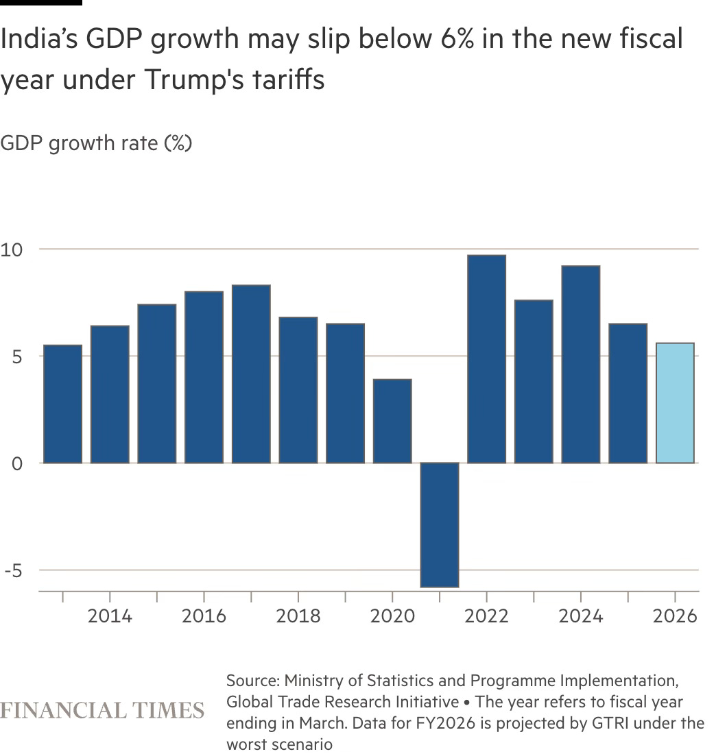 This chart should not come as a surprise. It shows the likely consequence of sustained tariffs: India’s projected growth dipping below six per cent, with employment gains cooling and investment intent softening. A few tenths off headline growth may look technical, but momentum is the story. Break the rhythm and you weaken the narrative that attracts capital, creates jobs and sustains confidence.
