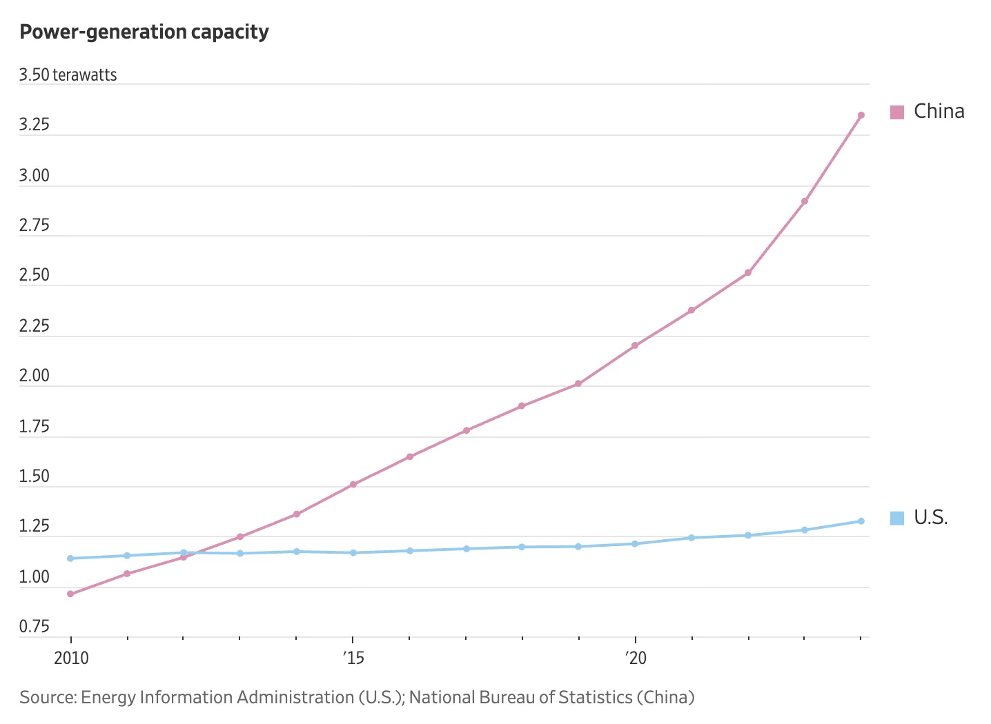 China’s power generation capacity has surged from under one terawatt in 2010 to well above three terawatts today. The US, by contrast, has edged up only modestly, moving from just over one terawatt to around one point three. The gap is no longer marginal. It has widened year after year, and the pace on the Chinese side is accelerating rather than slowing.