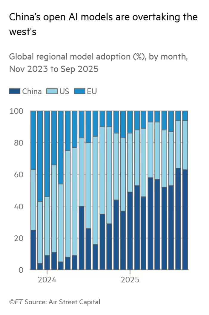 This chart shows that by late 2025, Chinese AI models will account for the largest share of global usage, overtaking both the US and EU. It is a rapid turnaround that reflects China’s push to build domestic alternatives to Western platforms and to open-source its own large language models for broader use.