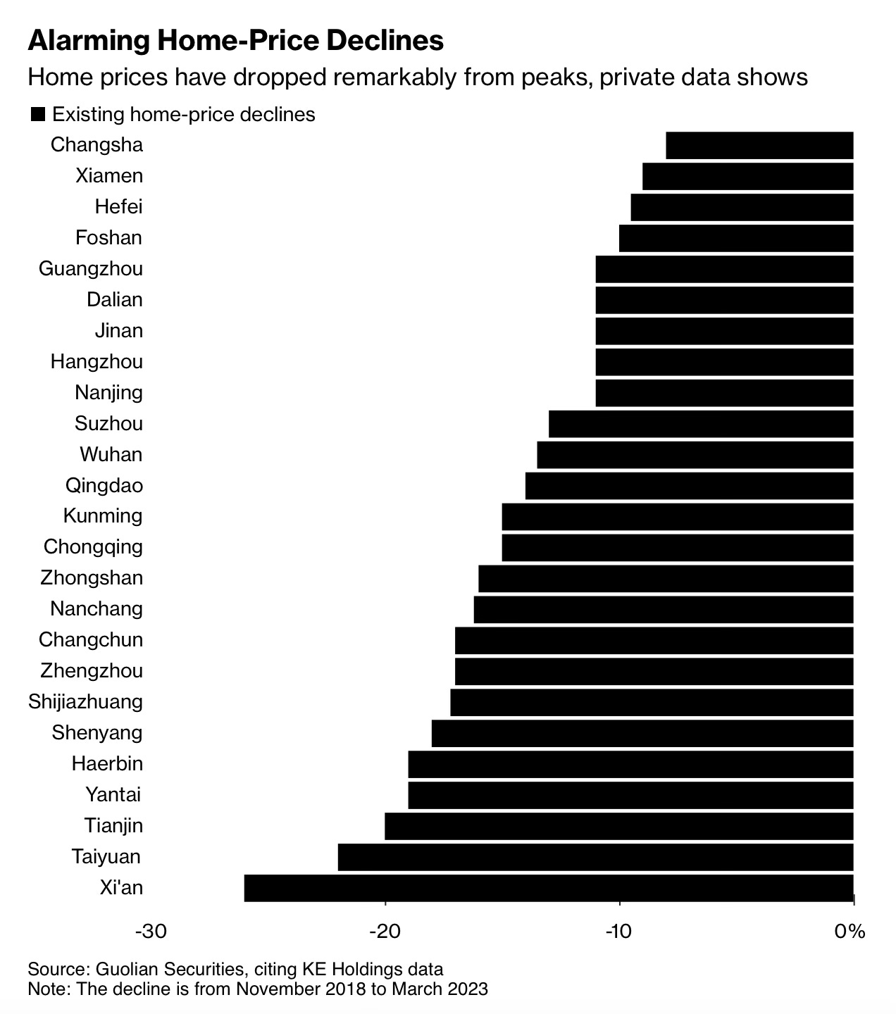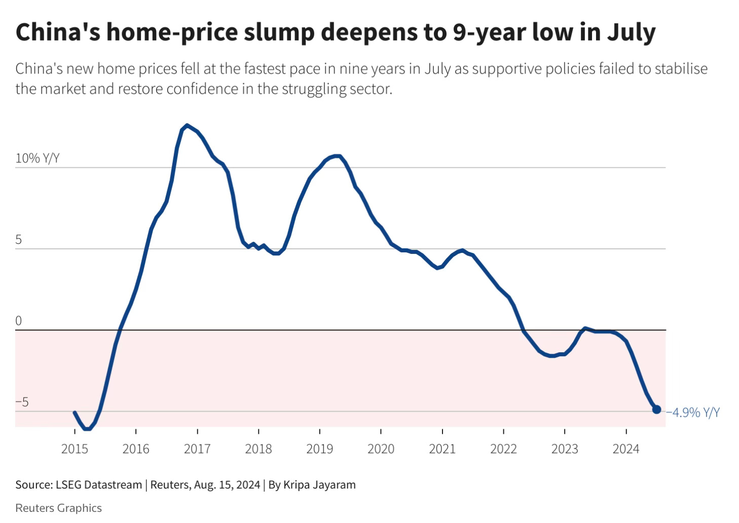 China's property market is facing a severe downturn, with far-reaching implications both at home and abroad. While official data suggests a modest decline, reports from estate agents paint a more concerning picture, with some areas experiencing price drops of up to 25 percent. This discrepancy raises questions about the reliability of official figures and their impact on market perceptions. Nevertheless, these two charts from Reuters and Bloomberg – both based on official data – are still shocking.