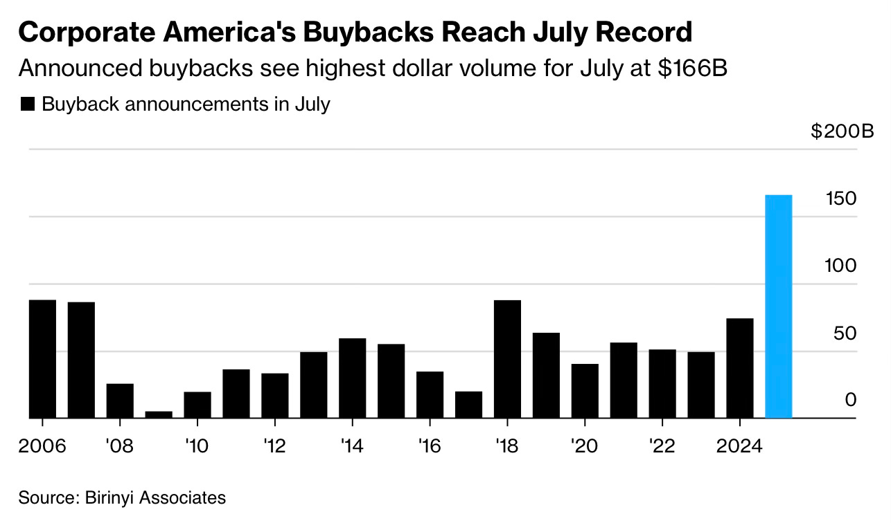 Corporate America is putting its money where its mouth is. July's $166 billion in buyback announcements shattered records for the month, propelling 2025 towards an unprecedented $1.1 trillion total – a figure that would eclipse last year's already eye-watering $942.5 billion record. Tech giants are leading the charge, with Microsoft committing $80 billion this fiscal year alone, while Amazon, Alphabet and Meta collectively plan to deploy over $300 billion.
