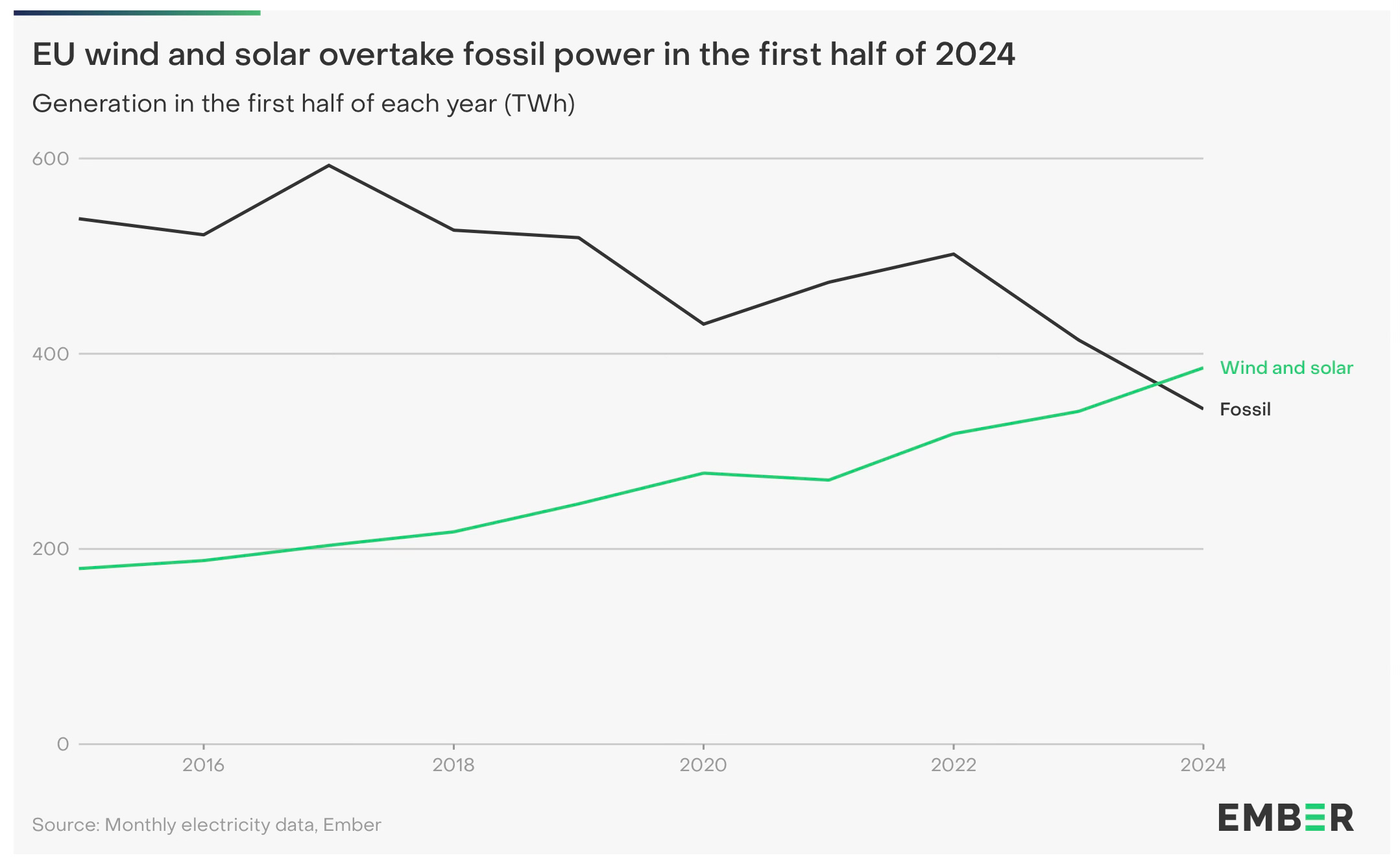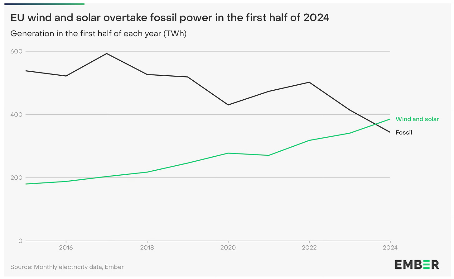 The statistics are striking: in the first six months of 2024, wind and solar energy provided 30 percent (386 TWh) of the EU's electricity, overtaking fossil fuels, which accounted for just 27 percent (343 TWh).