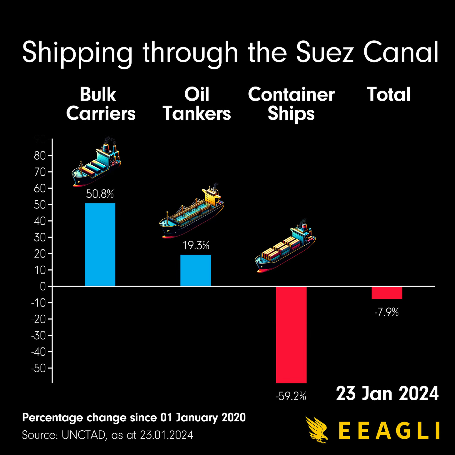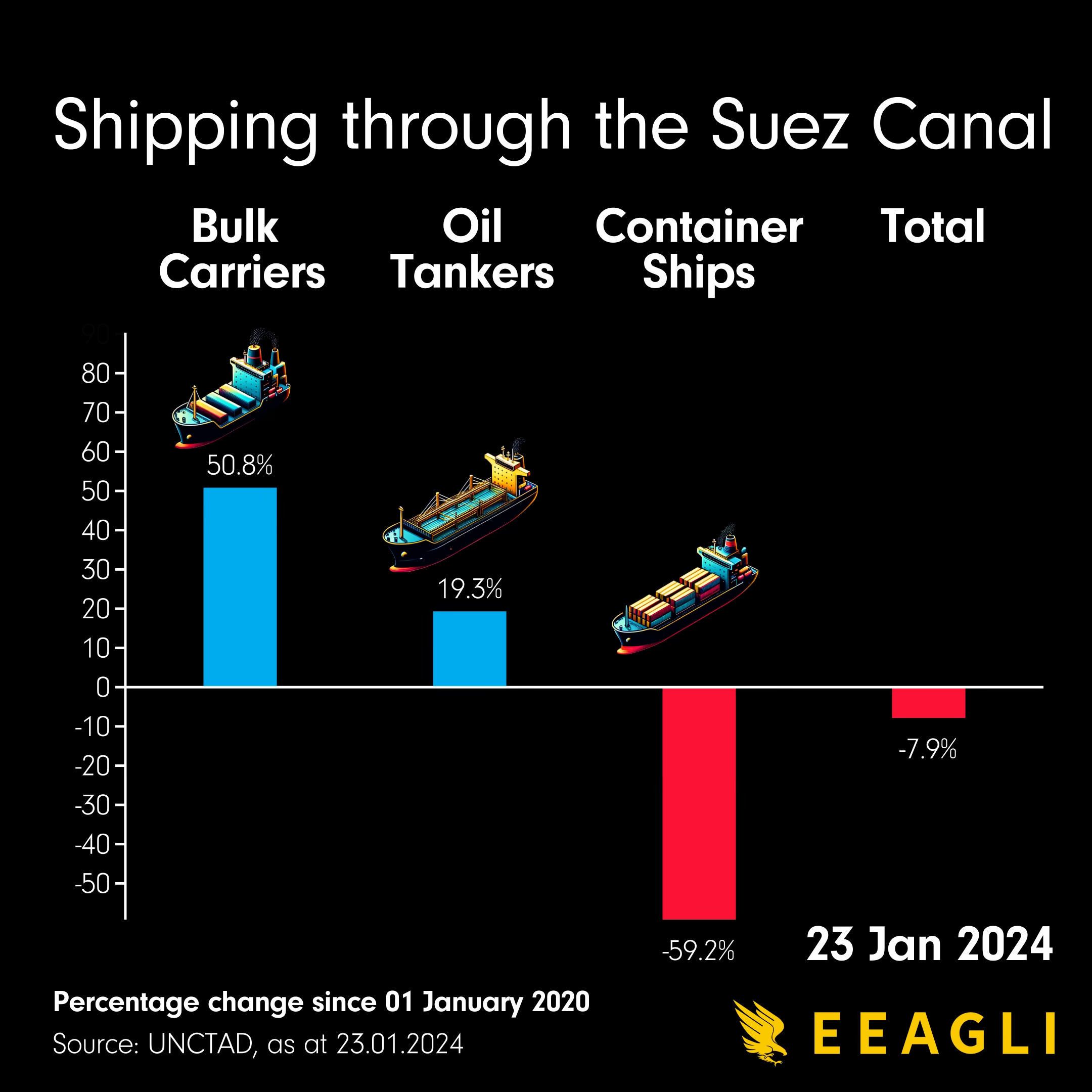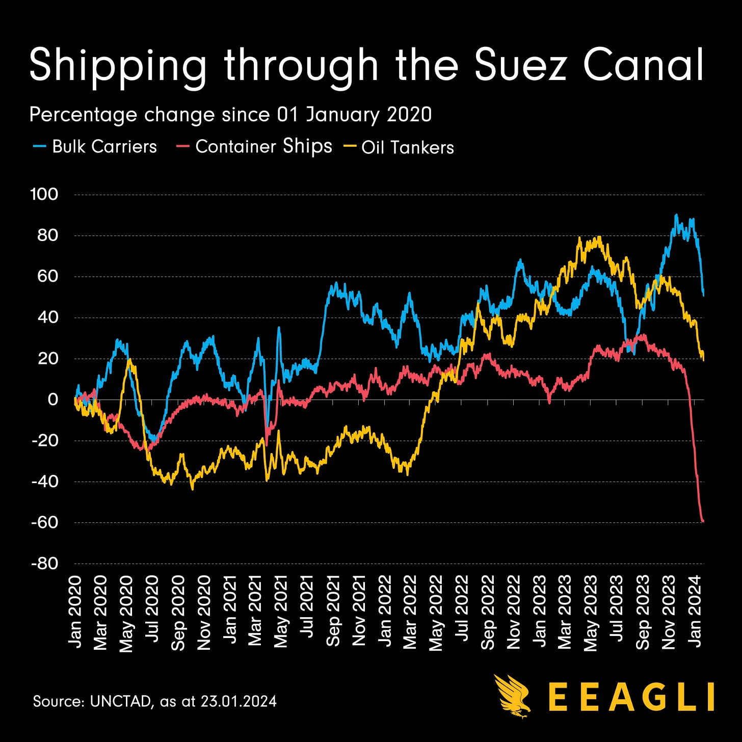 Let's talk about shipping. The Houthi attacks in the Red Sea have received a lot of press coverage recently. It's having a direct impact on the Suez Canal, which is what this first chart is all about. I couldn't just include one chart on this topic –I've provided another fresh angle, plus one animated data visualisation.