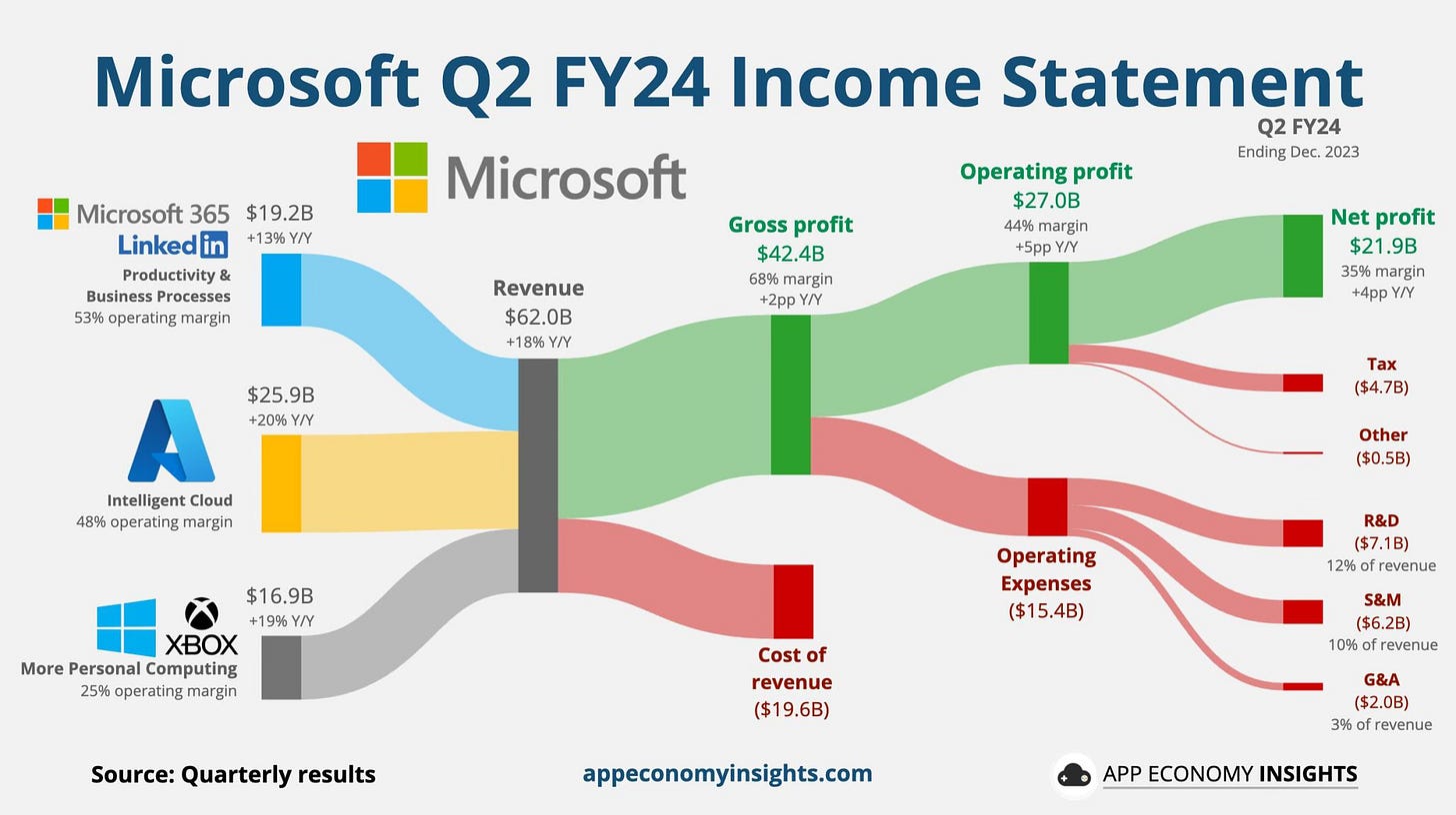 Nevertheless, the strong growth it has experienced in cloud and gaming has helped bolster its overall performance. The company's focus now remains on AI-driven innovation. Take a look a the chart below to visually see how the breakdown of Microsoft’s income statement looks.