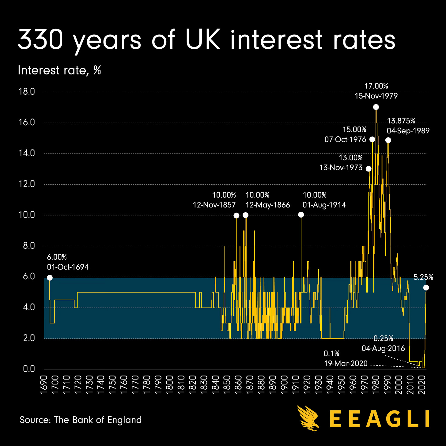 Here's 330 years of UK interest rates. Why? Comparing 5.25% to history is just interesting. Why just look back a mere 50 years when you can go back to 1694, which was the year the Bank of England was founded?