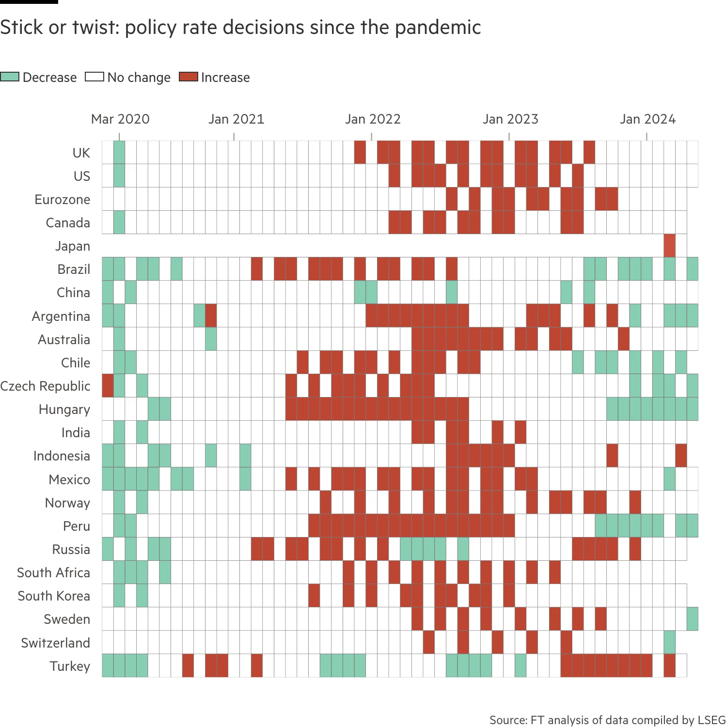 Currently, headline inflation is gradually receding. Some central banks, particularly those in emerging markets, have initiated interest rate cuts, as evidenced in the remarkable heat map of interest rates by the Financial Times. Many more are anticipated to follow suit this year, including the US Federal Reserve, the European Central Bank, and the Bank of England.