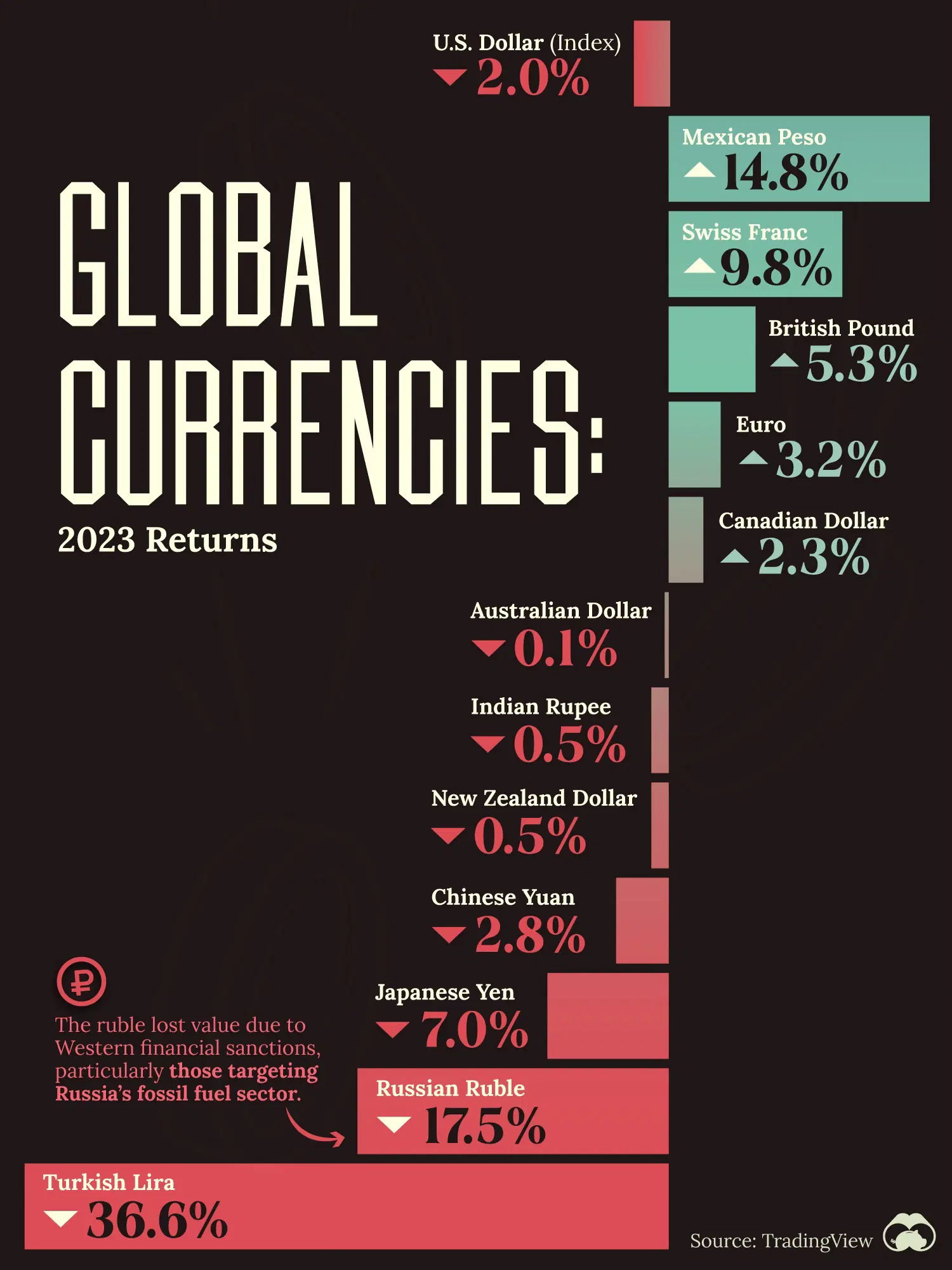 So take a look at this data visualisation from Visual Capitalist; it resonated with me. I don't really have a relationship with the Mexican peso, so I can't express my opinion here. But I do have a relationship with the Swiss franc because I live in Switzerland, while Pound sterling, the euro and the US dollar are important for my business.