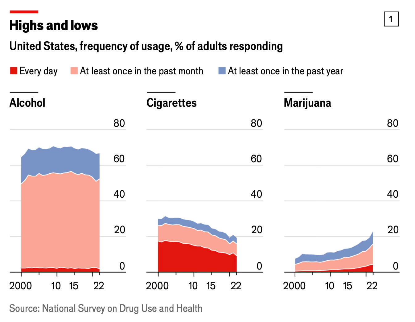 To an extent, there is some sort of substitution effect going on between cigarettes and marijuana. Likewise, there is probably, to a lesser extent, a substitution effect between alcohol and marijuana. Nonetheless, the rising trend in marijuana consumption does raise concerns because, even if it is less toxic and lethal than alcohol and cigarettes, it is still not necessarily good for you.