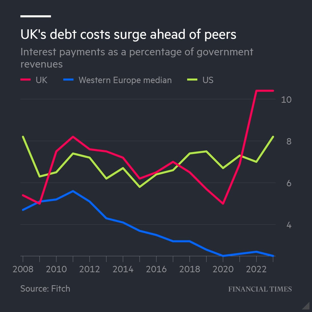 Debt interest costs as a proportion of revenue are a key measure of debt affordability and have jumped in the UK in the past couple of years.