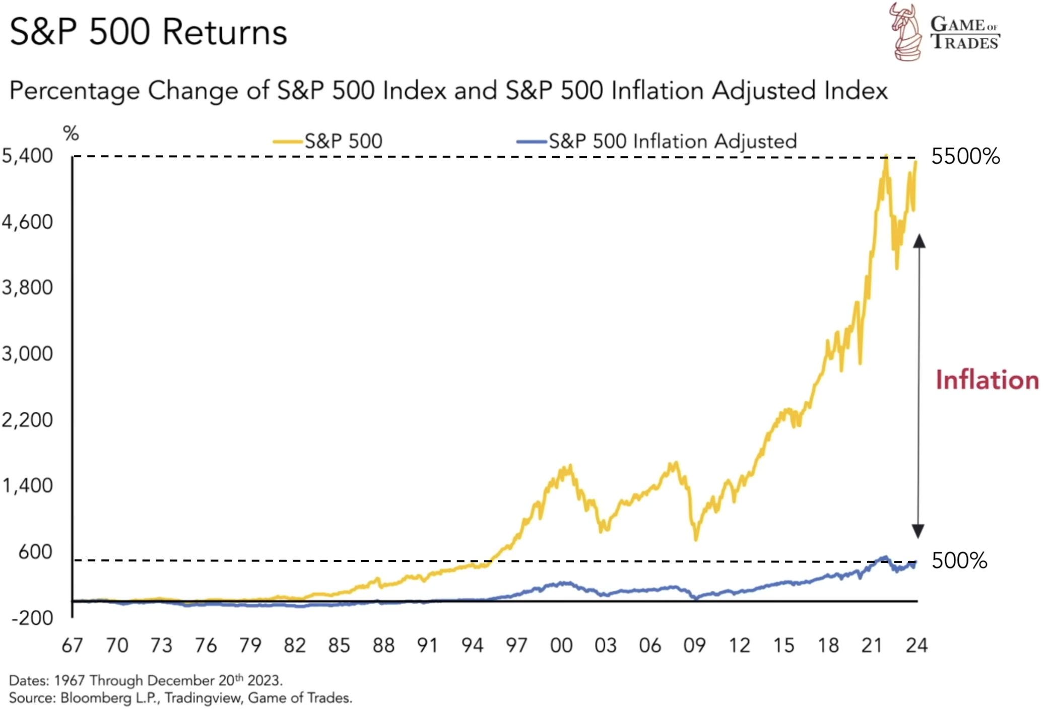 Here you can see the difference in return between the nominal and real return on the S&P 500 index. Moreover, you can clearly see the effects of compounding drastically weakened. Over the long run, the results are quite shocking: if you invested in the S&P 500 in 1967, in nominal terms, you might have achieved a return of 5,500 percent, but in real terms, that return is closer to 500 percent.