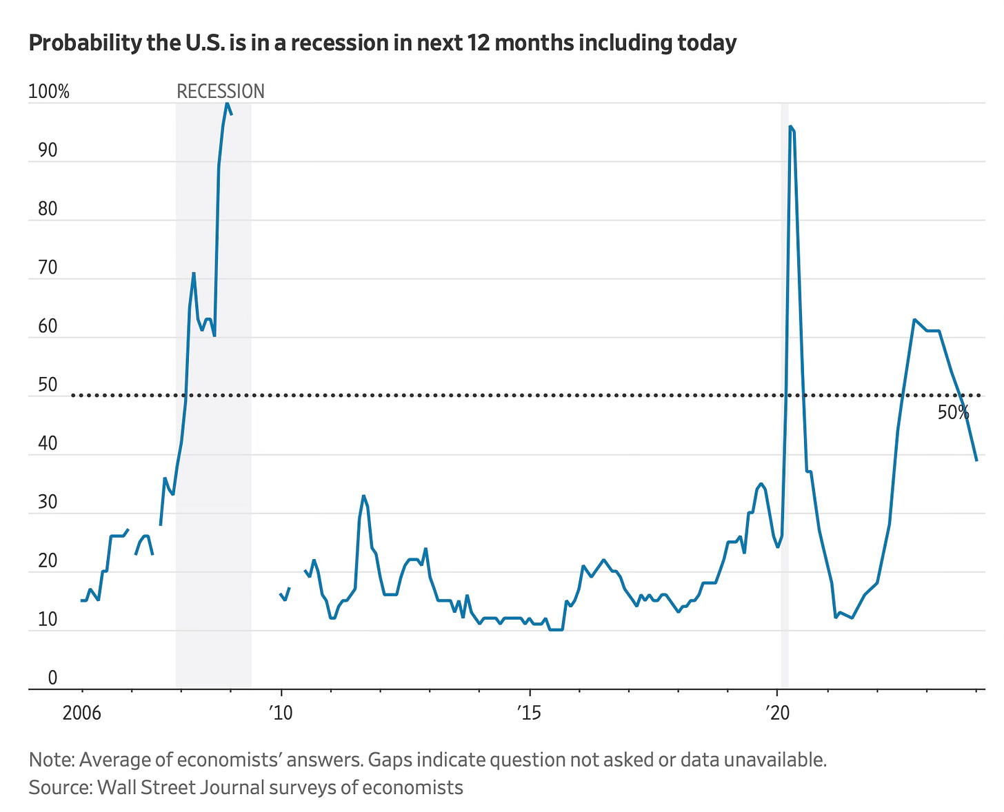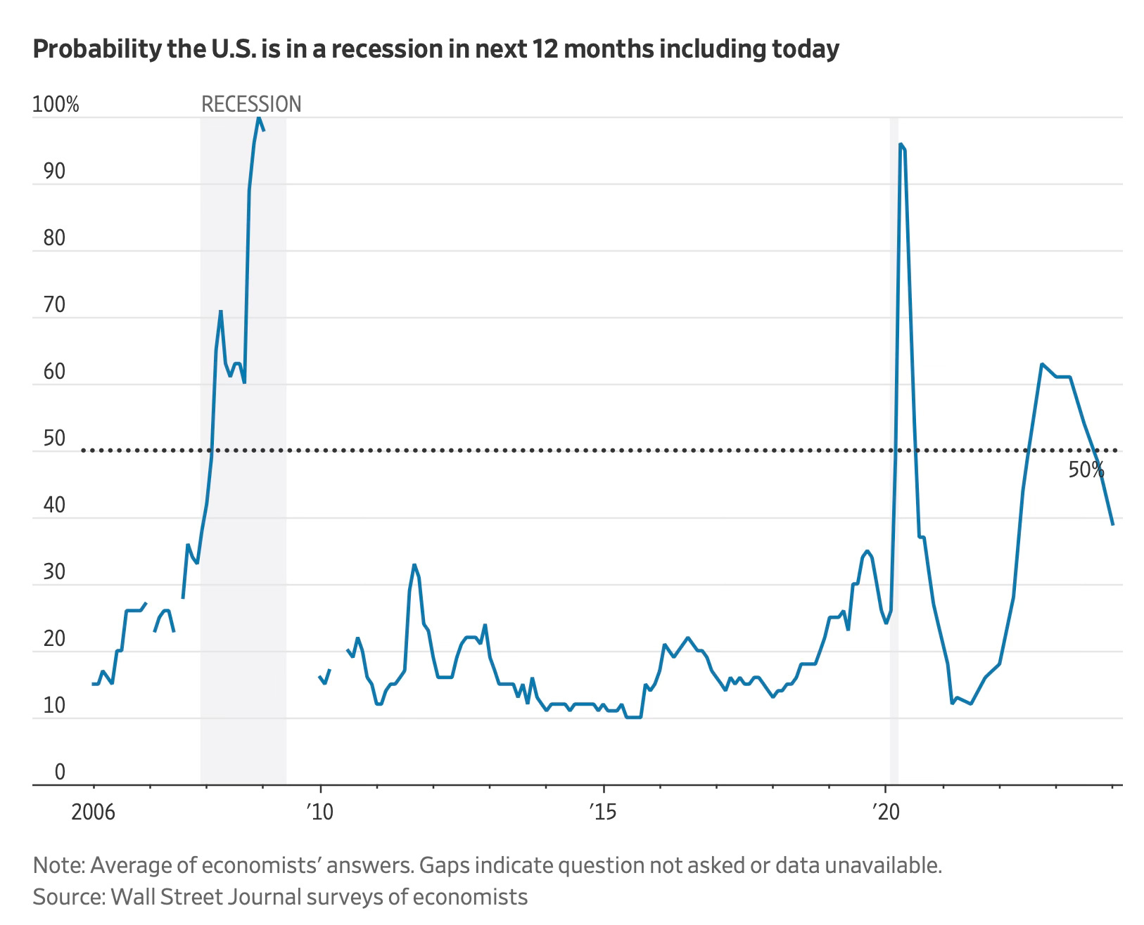 It never came! Now economists are revising their predictions for 2024. According to a survey carried out by the Wall Street Journal, 61% of economist predicted that the US would go into recession in the next 12 month. That has now fallen to just 39% in January 2024. It’s quite a reversal. So what happened?