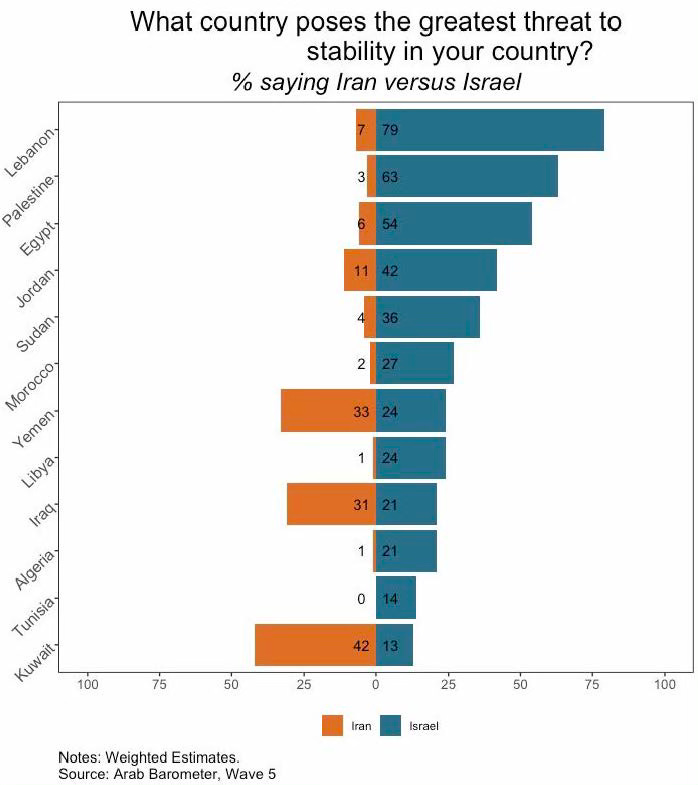 The sentiment toward Israel is unsurprising, with countries within the Levant and Egypt expressing the most negativity towards Israel. However, the real story lies with Yemen, Iraq and Kuwait, which view Iran as a bigger threat than Israel.