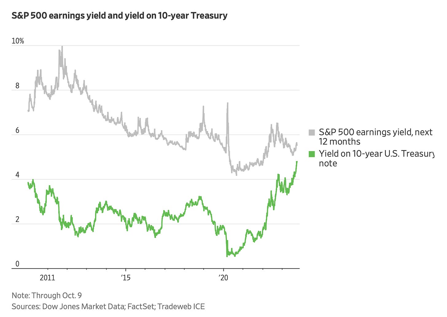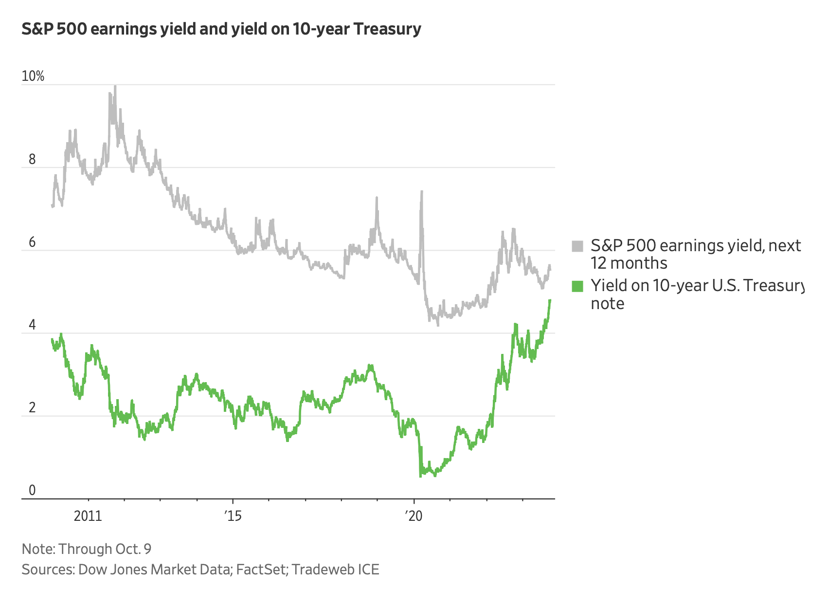 This chart fits this story well. What you see is the decline of the equity risk premium that equity investors once enjoyed. This is largely due to surging bonds that have risen in response the the US Federal Reserve's interest rate tightening cycle.