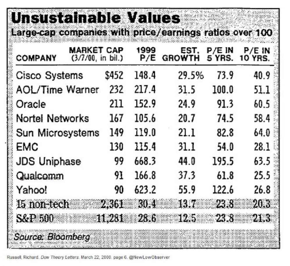 In many ways that’s what happened with the dot-com bubble, which sort of happened around the same time. Investors were in love with the future. The Internet was about to take over the economy and e-commerce was all the rage. Then pop! That's what this table below is about. A snapshot of innocence and over exuberance about the future.