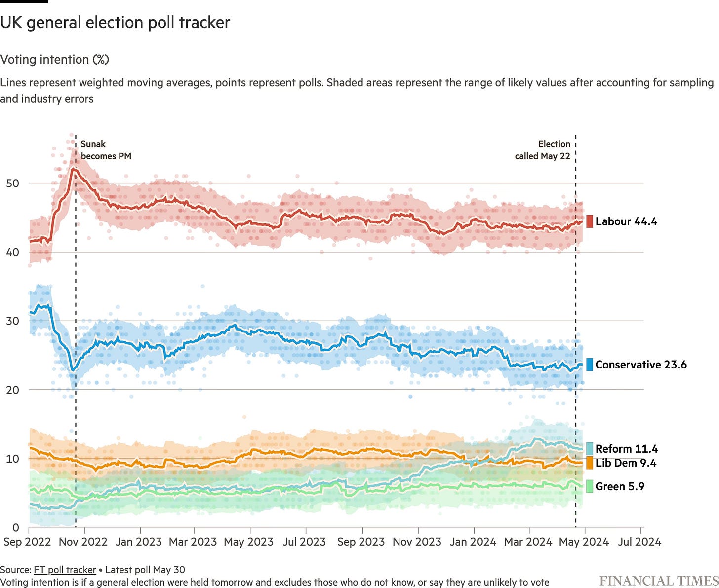 So take a look at this chart and let me know your thoughts in the comments section. Prime Minister Rishi Sunak seems to be in a spot of trouble and has been for some time now. The FT has put together their own poll tracker, which is not too dissimilar to the results shown by YouGov, which I’ve also thrown in as a loose comparable.