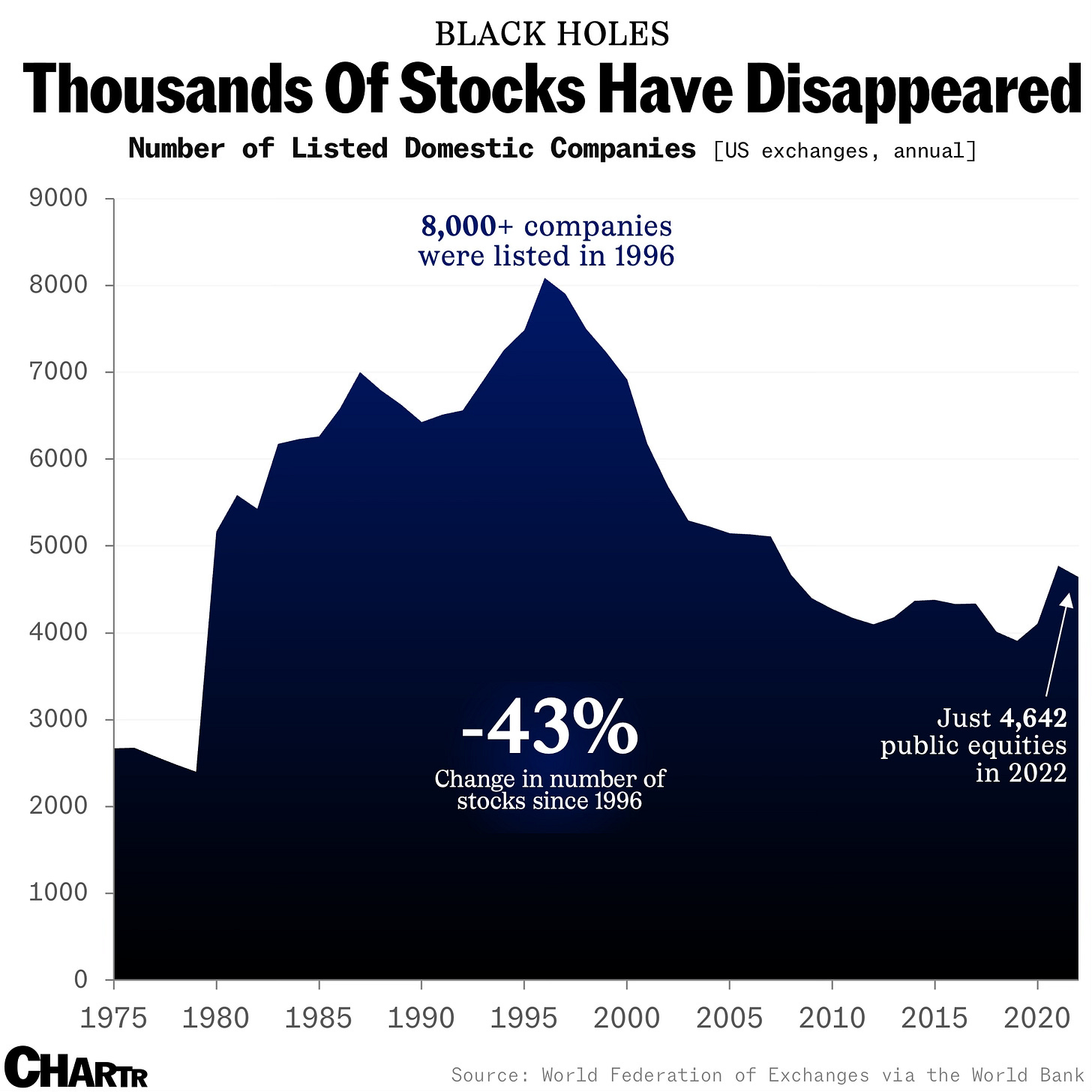 This is a great chart from Chartr. It’s something that I was completely unaware of personally. I never knew that the decline in the number of public companies in the US has been so rapid.