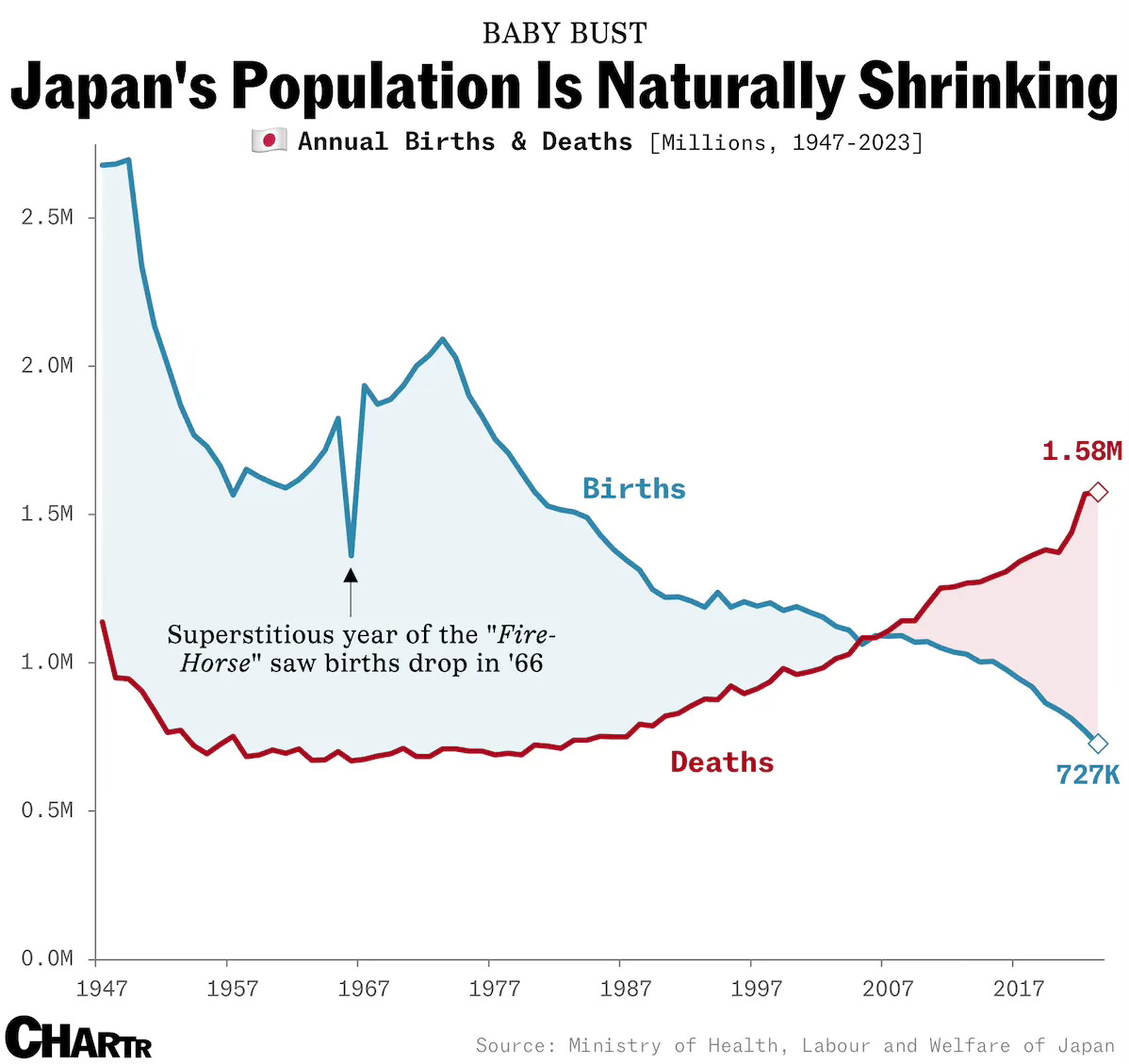The dating app aims to engage the 70 per cent of individuals who wish to marry but are not actively seeking partners. Time is not on Japan’s side as you can see in this chart from Chartr – Japan’s population is naturally shrinking.