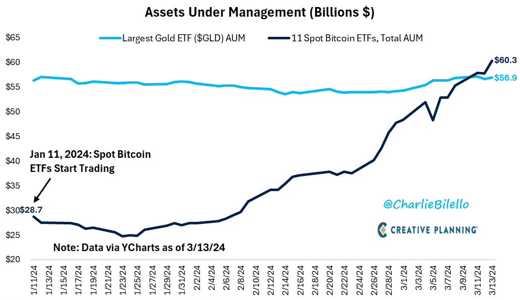 If you don’t believe me then check out the first chart produced by Charlie Bilello because that's where we are. Assets Under Management (AUM) for these novel Bitcoin ETFs have more than doubled from their starting mark.
