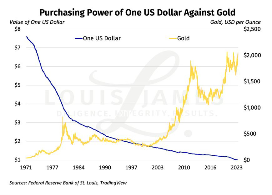 But before we get to the second chart, let's start with the first one. I found this particularly interesting. It compares the purchasing power of a dollar, versus gold, since 1971. The chart isn't labelled very well, but the story is interesting.