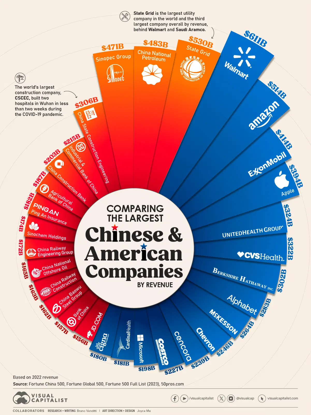 This data visualisation from Visual Capitalist compares the 15 largest Chinese and American companies by their 2022 revenue, drawing data from the Fortune China 500 and Fortune Global 500. It shows that China's largest company, State Grid, ranks third globally in revenue, behind only Walmart and Saudi Aramco (not in the graphic).