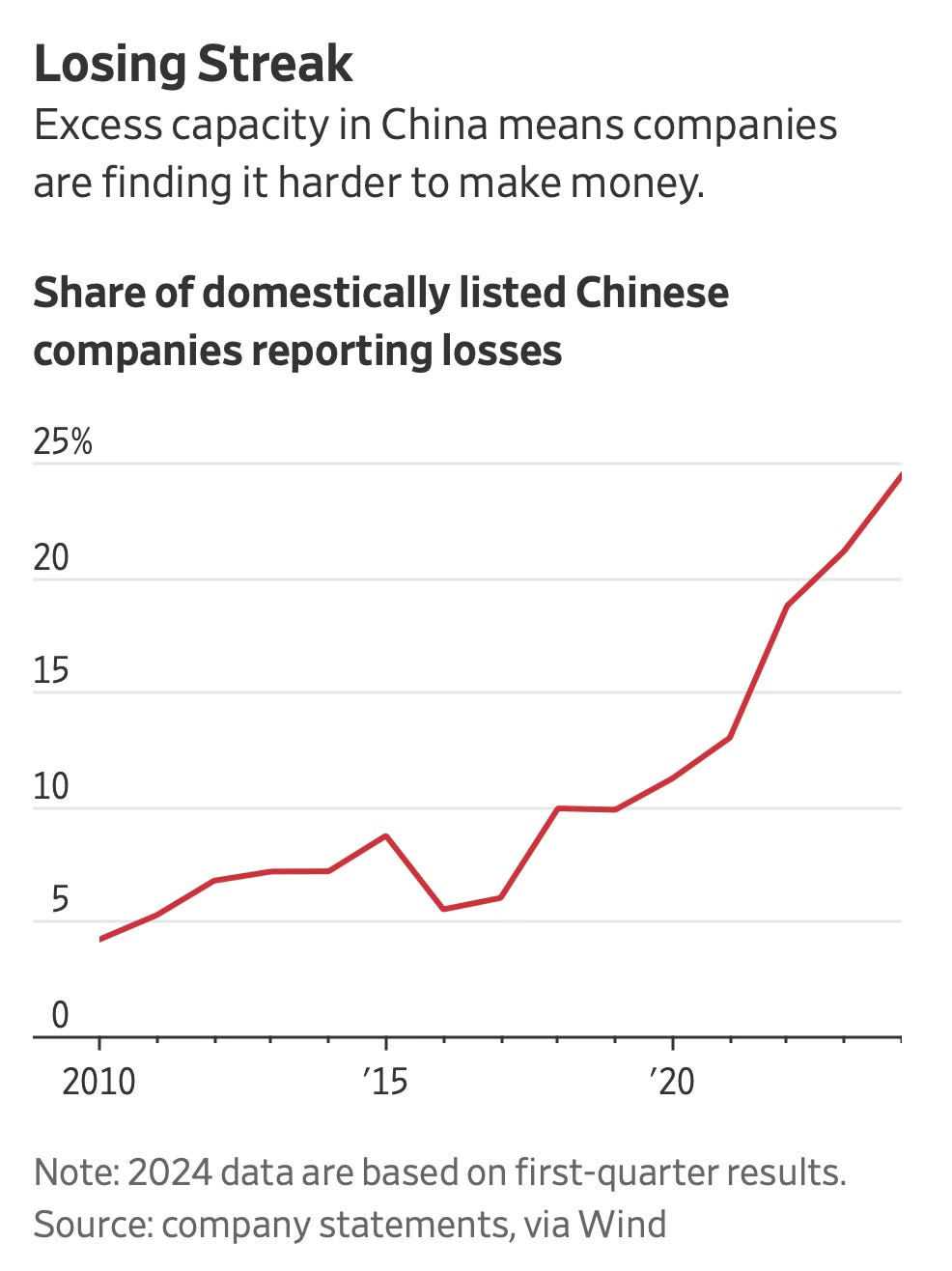 This chart from the Wall Street Journal paints a grim picture: the share of loss-making firms listed on Chinese exchanges has quintupled since 2010, with nearly a quarter now in the red. This malaise stems from Beijing's dogged pursuit of industrial growth at the expense of consumer spending, a strategy that has led to rampant overcapacity in sectors from electric vehicles to solar panels.
