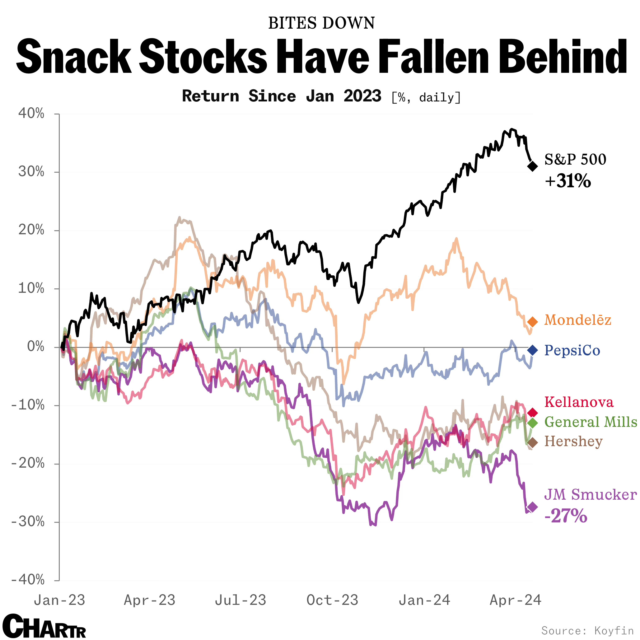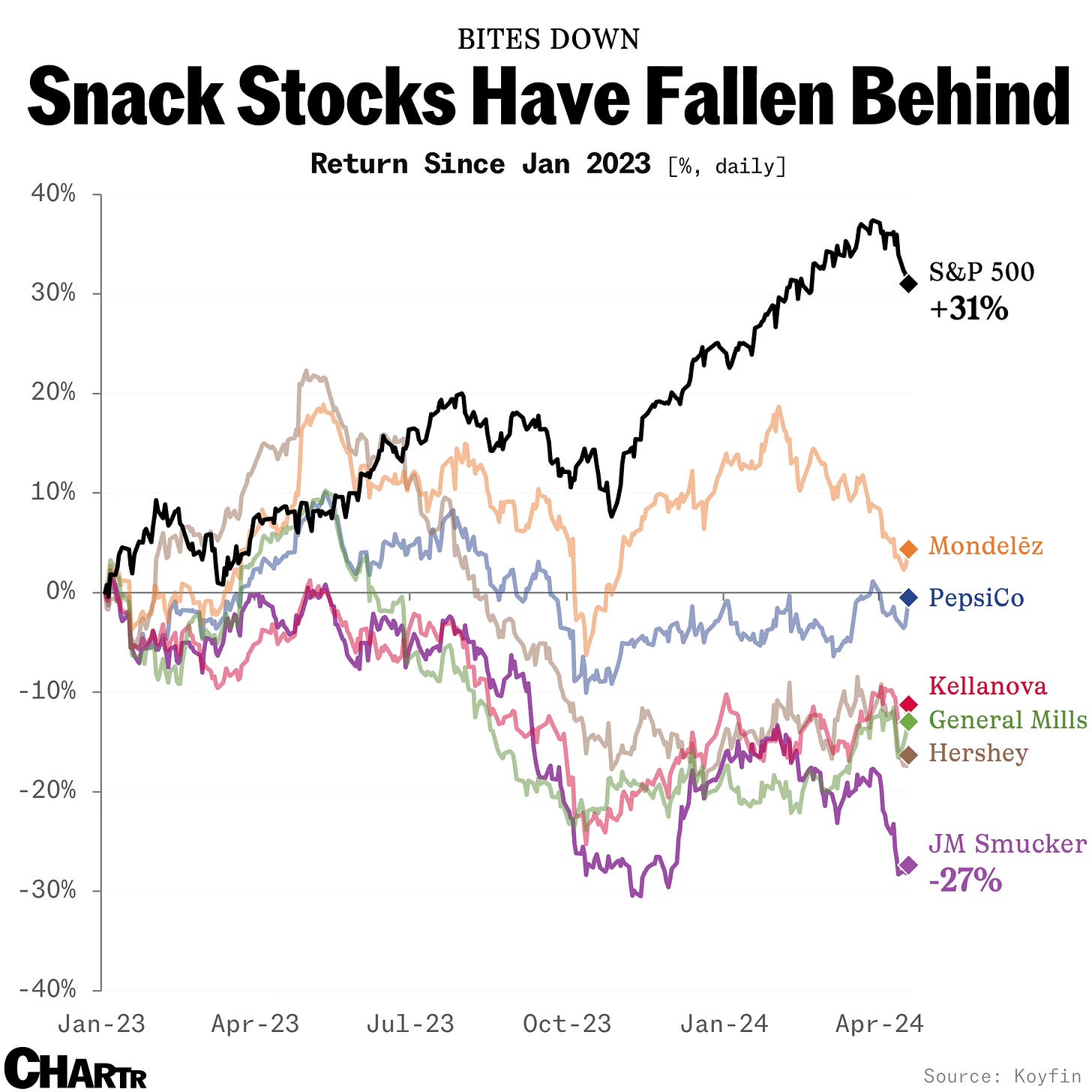 As an investment theme, snacks are more interesting. Take a look at this chart from Chartr on snack stocks. You don’t have to know any of the names here. All you need to know is that these stocks are considered classic income investments and that they are now a bit out of favour with the market.