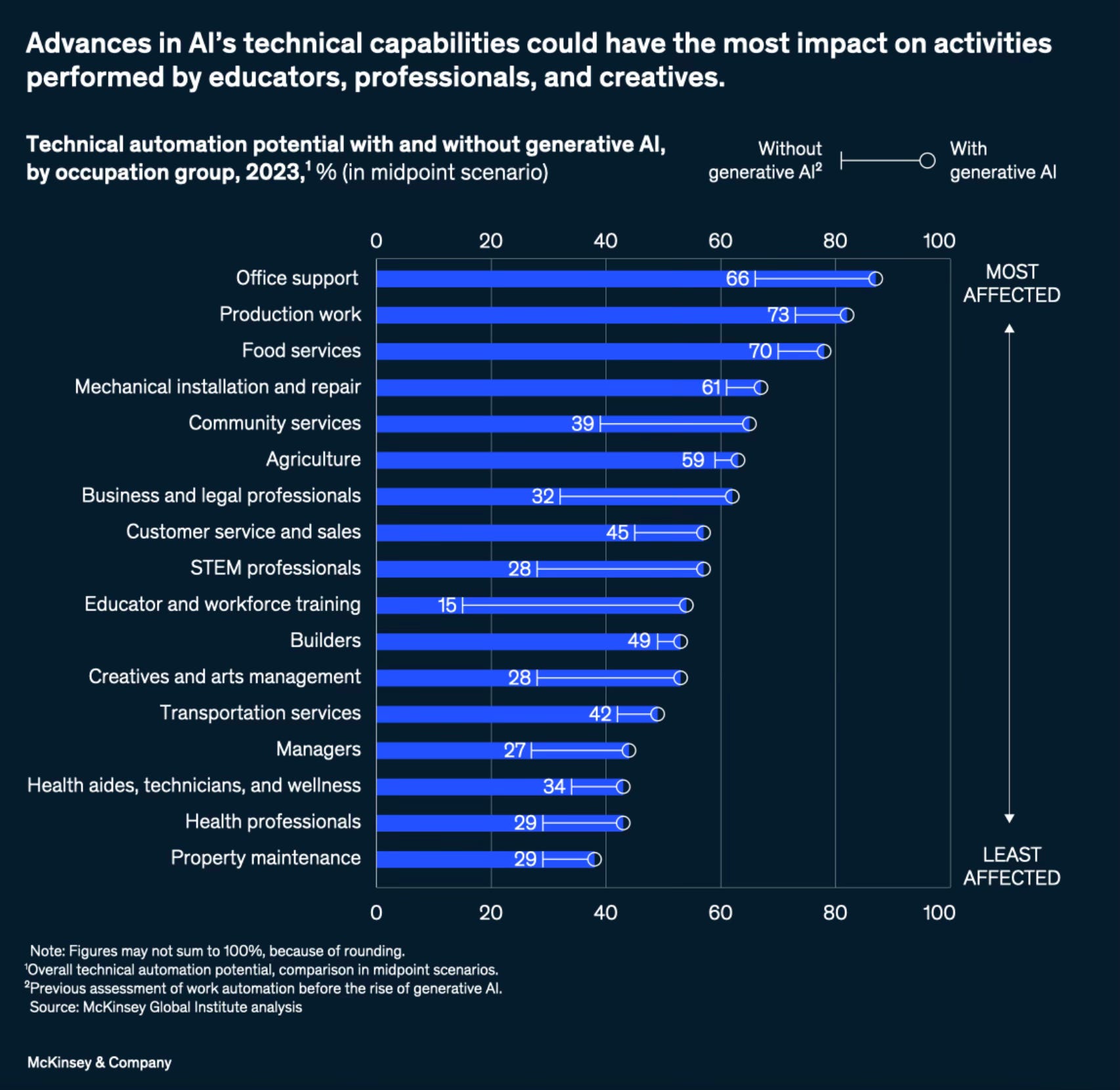 That's what today's date of visualisation is about. It is from McKenzie’s “2023: The year in charts”, which is 100% worth having a look at. It seems that professions that centre on communications and documentation are the most under threat.