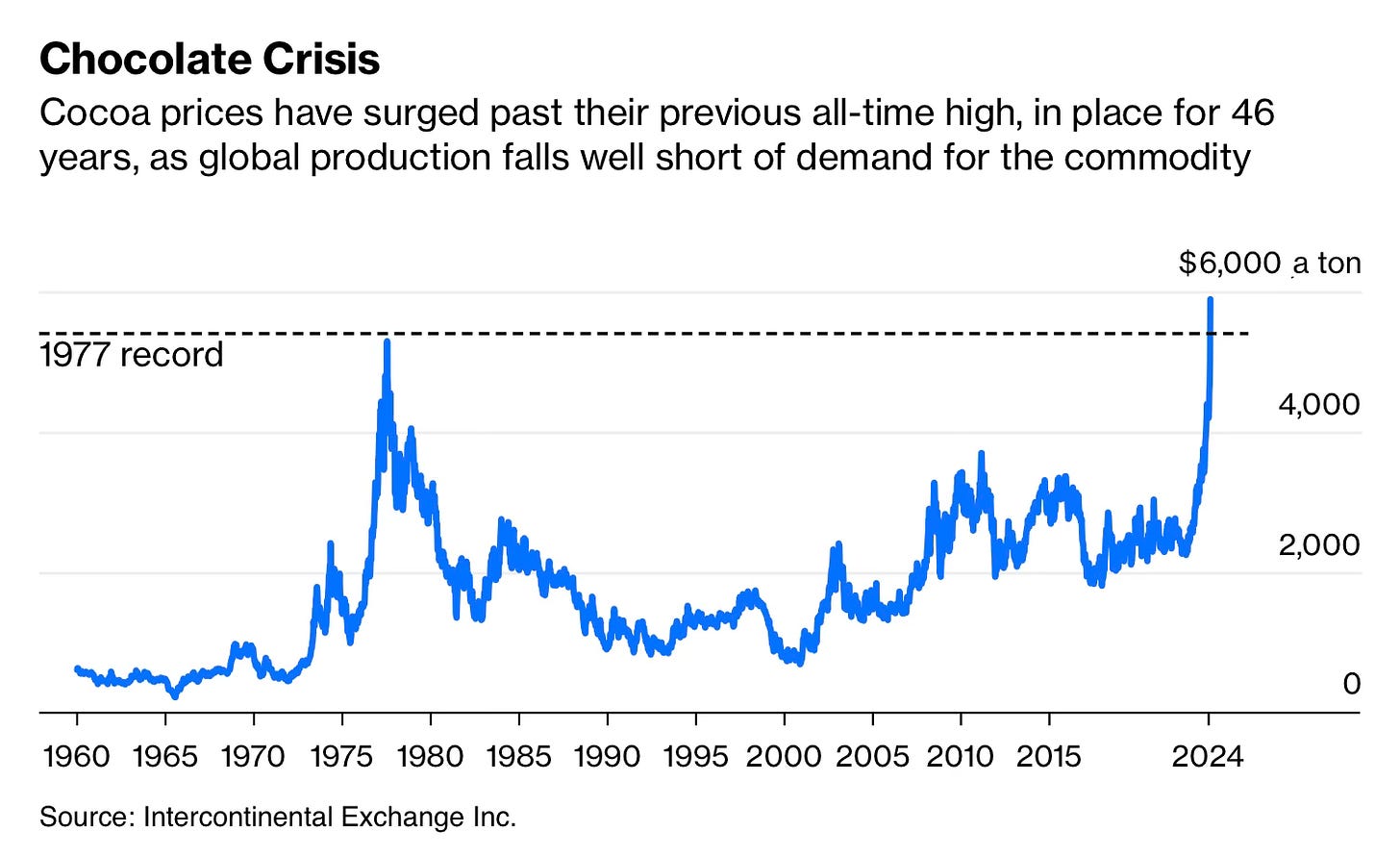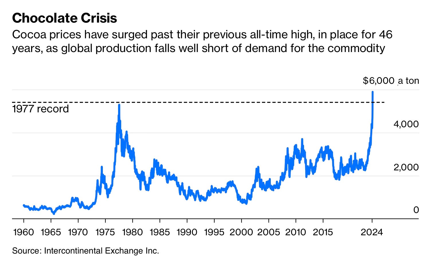 Consider the chart below. The world is facing a chocolate crisis. Cocoa prices have exceeded even their previous all-time high from the late 1970s. Global production has not kept pace with demand.