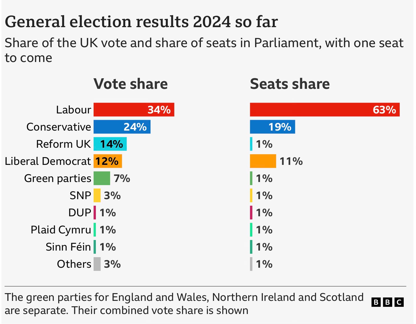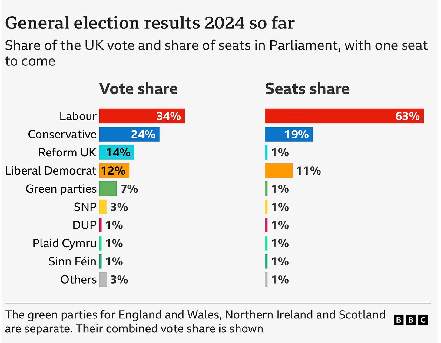 So back to the subject matter. The 2024 UK general election resulted in the largest-ever disparity between vote share and Parliamentary seat allocation. This unprecedented gap has reignited debates about electoral reform, with parties like Reform UK and the Green Party expressing frustration over their significant vote shares translating into minimal representation in Parliament.