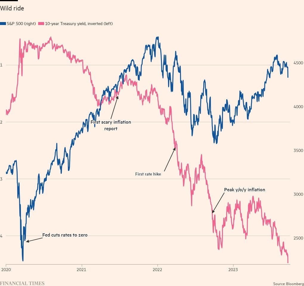 After the low point reached during the pandemic, the economic recovery saw stocks going up, while bonds fell. But then things flipped around and both started falling together in 2022.