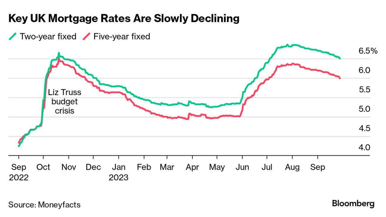 For many homeowners, buy-to-let landlords and first-time buyers, this is a chart that might provide some relief. I also love how Bloomberg have kicked it off with a label referencing Liz Truss’ disastrous stint as Prime Minister last year. It’s slightly political, but appropriate.