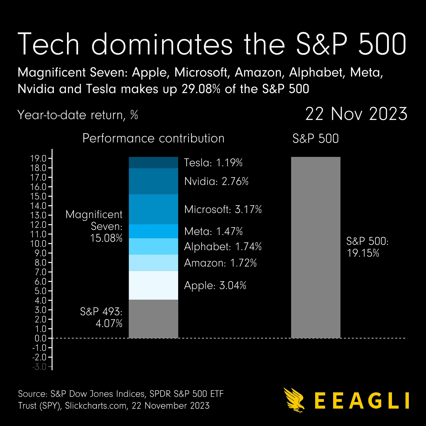 It's pretty mad isn't it? Without those seven magnificent, mega technology firms, we as investors would've only earned 4.07% from the S&P 500 this year. Bear in mind inflation is 3.2% in the United States year-on-year.