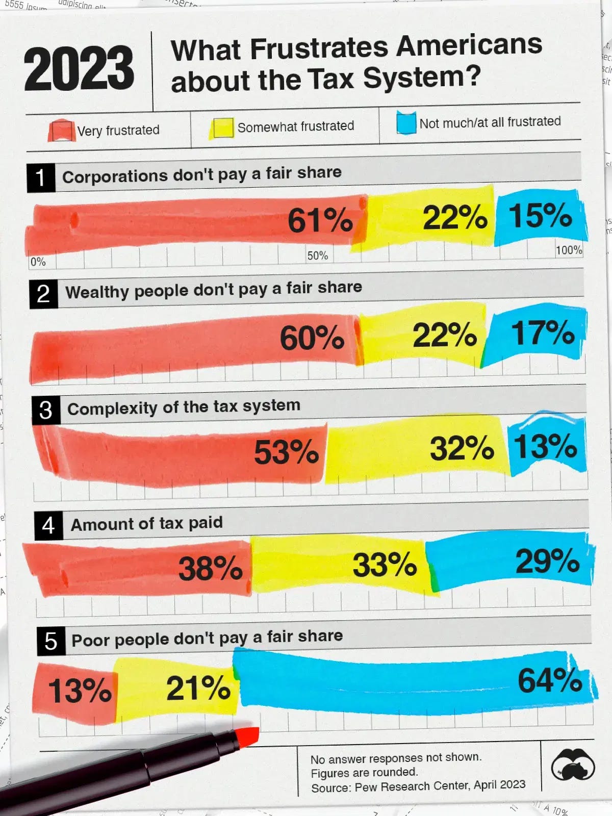 The dataset here is from Pew Research, illustrating the levels of frustration among respondents regarding general complaints about the American federal tax system. Bear in mind we are talking only about federal tax here and not about all those other weird taxes I mentioned.