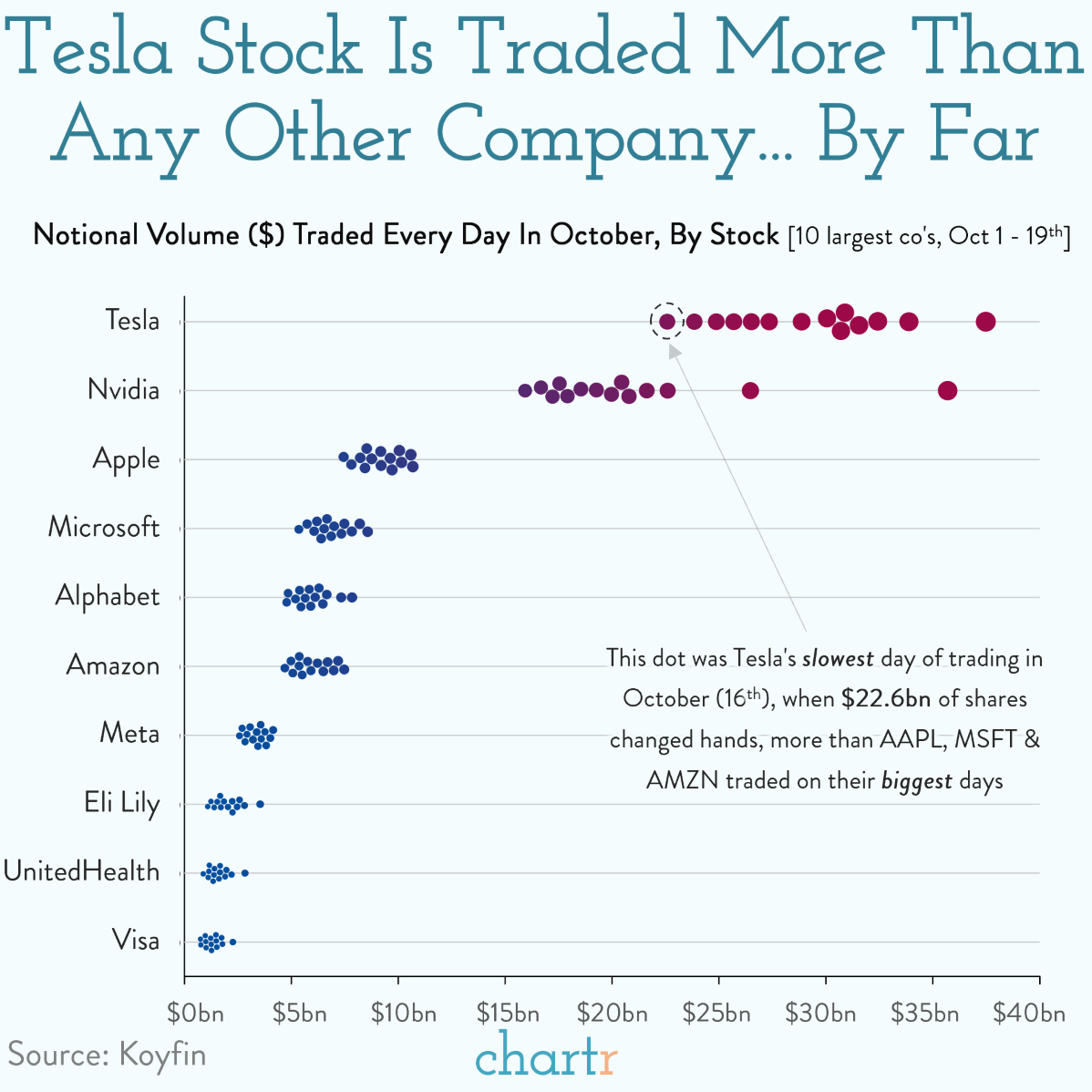 That’s what this first chart is about. Investors still love Tesla and you can see this in Tesla’s trending volumes that dominate the market. Even on its slowest day, with a trading volume of $22.6bn on 16 October 2023, Tesla outshone the heaviest trading days of tech giants like Apple, Microsoft and Amazon. In terms of stock trading, Tesla isn't just leading the race – it's lapping its competitors!
