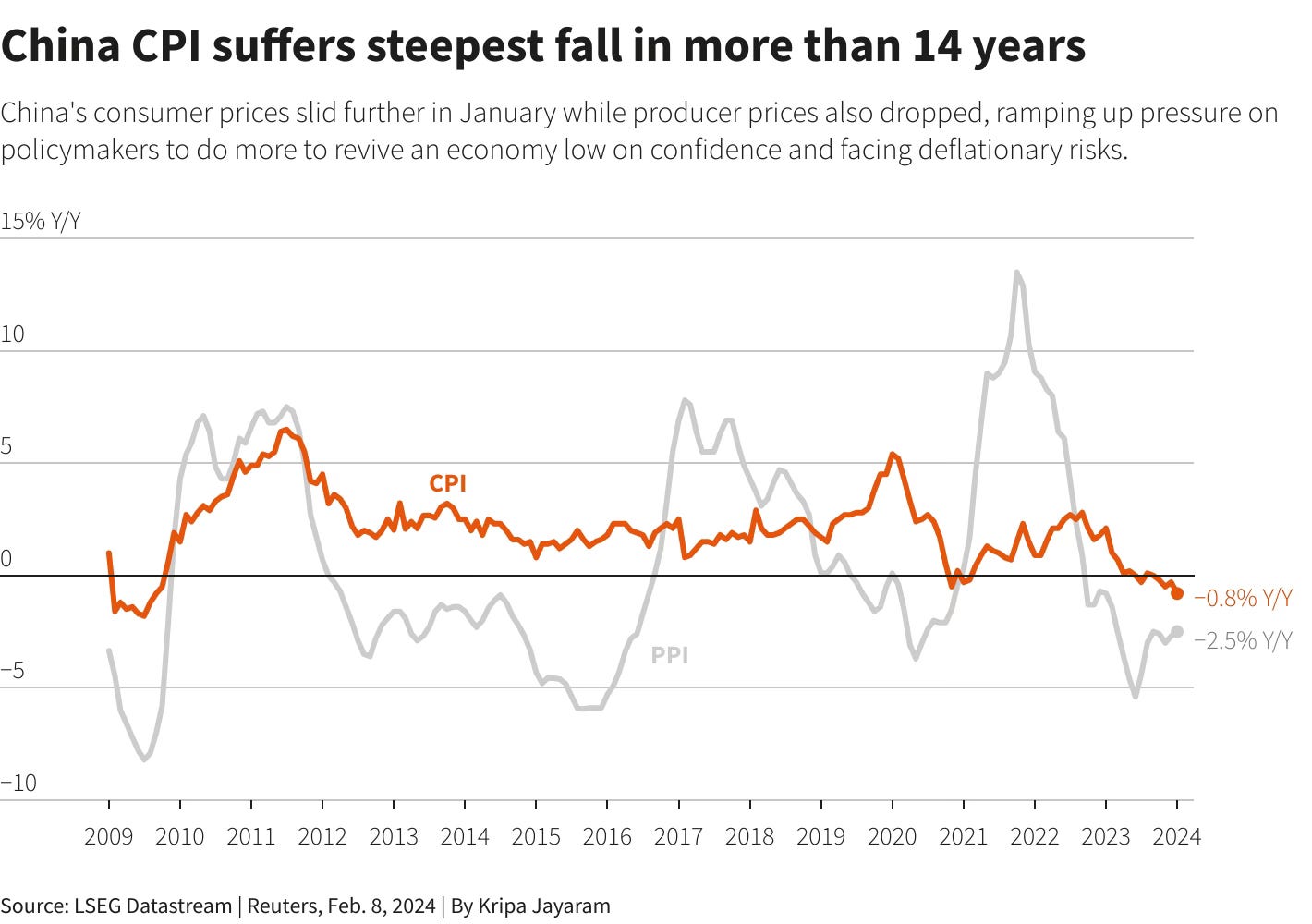 Naturally, economic growth has cooled rapidly. In fact, there is even talk of deflation in China. This chart shows just how significant this slowdown has become. China's consumer prices experienced their sharpest decline in over 14 years in January, accompanied by a drop in producer prices.
