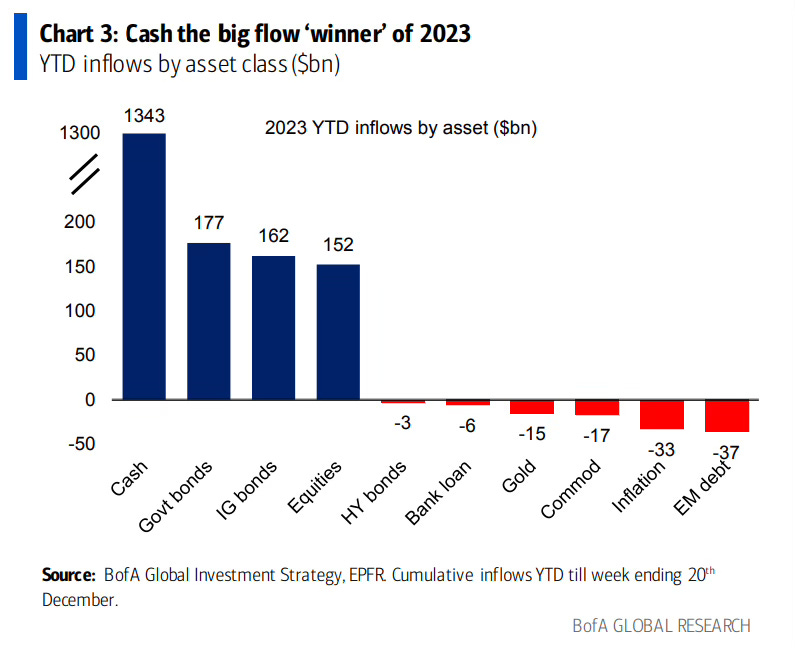 That seems to be the sentiment among investors in 2023. The largest inflows were into liquid cash, followed by bonds, a more diverse monetary asset. There were also positive inflows into equities, but cash rules right now.