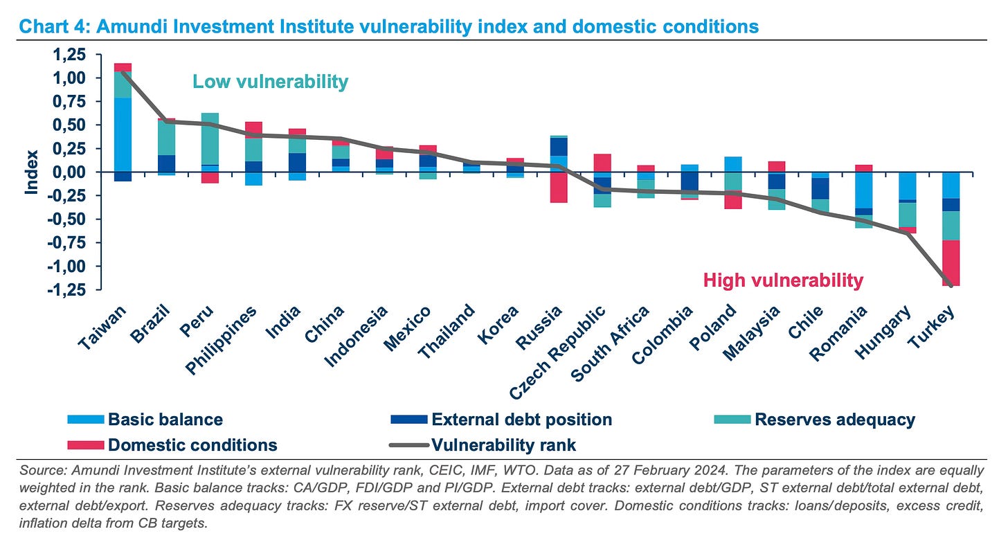Nonetheless, there's notable dispersion in economic conditions across EM countries, reflecting a range of vulnerabilities and strengths which you can see in this chart below. However, despite these differences, Amundi points out that the overall credit quality of EM external sovereigns has shown notable improvement, moving from an average “B” rating in the 1990s to predominantly investment-grade levels today, offering compelling options within the credit markets due to their longer duration and higher yields compared to US high-yield counterparts.