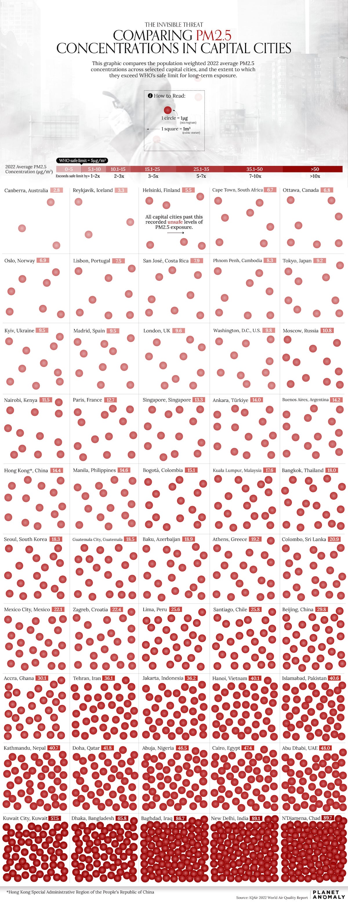 I’m seriously impressed with this data visualisation from Visual Capitalist. To some one like me, the term “PM2.5 concentrations” doesn’t mean a lot. But when you visualise it like this, it makes a lot of sense.
