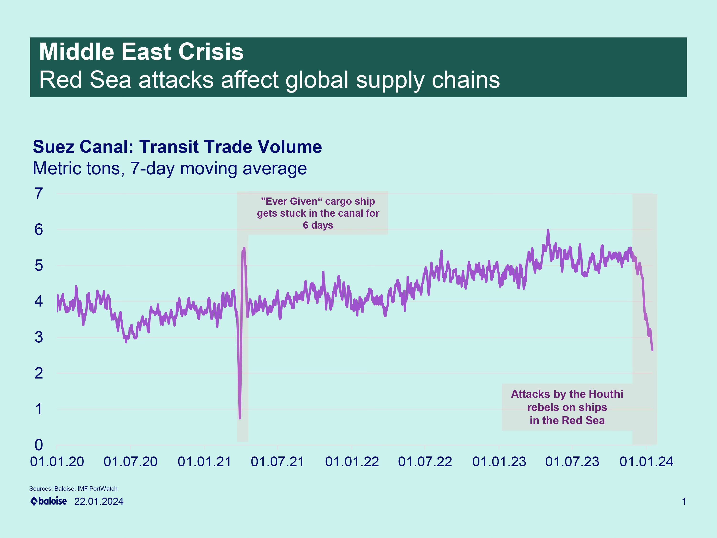 The strategy seems to be effective. Even though the supply routes have little to do with North America, the effects of shipping through the Suez Canal are being felt and will eventually have some ripple effects. This chart from Baloise illustrates this trend quite well. The last time a drop in traffic was experienced like this was when the Ever Given got stuck in the canal in 2021.