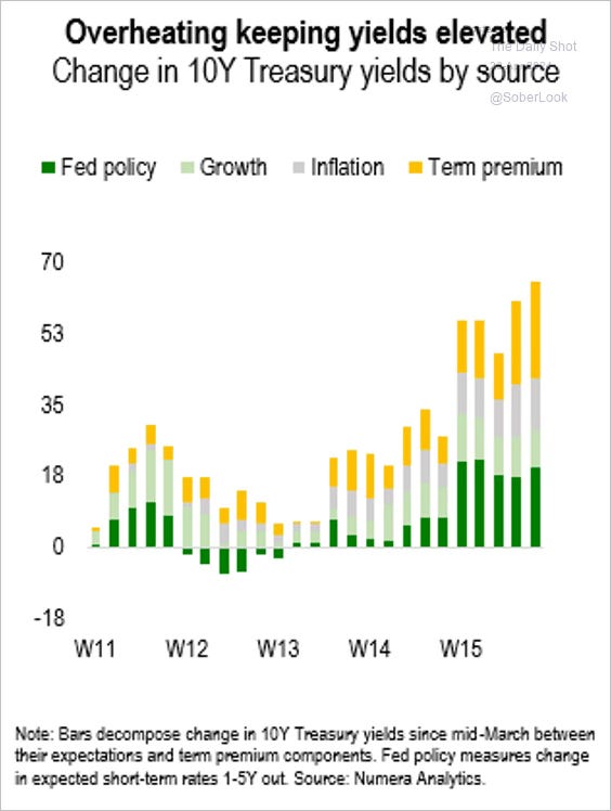 Viewing the story from this angle, the other bars make sense. The Federal Reserve is likely to keep rates on hold and may even raise interest rates. Growth, as mentioned, appears to be a contributing factor. And inflation (as we've also mentioned) seems to be contributing to this uptick in yield as well. These four factors – Federal Reserve policy, growth, inflation and term premium – all seem to contribute to the 10-year US Treasury yield and are all intertwined. That’s what is propping up the 10-year US Treasury yield right now.