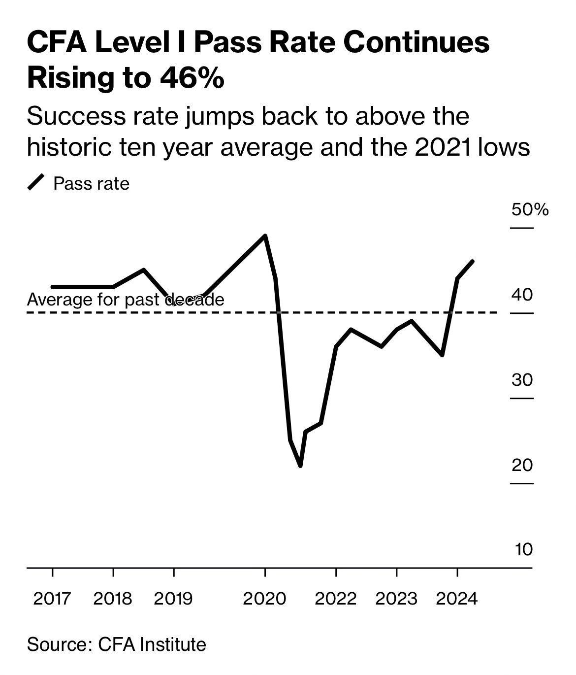 The pass rate for the first level of the CFA exam has risen to 44 per cent, surpassing its historic average. This is above the decade average of 40 per cent and marks a recovery from the lowest pass rate recorded in 2021, when exam performance was impacted by test-taking deferrals due to Covid-19.